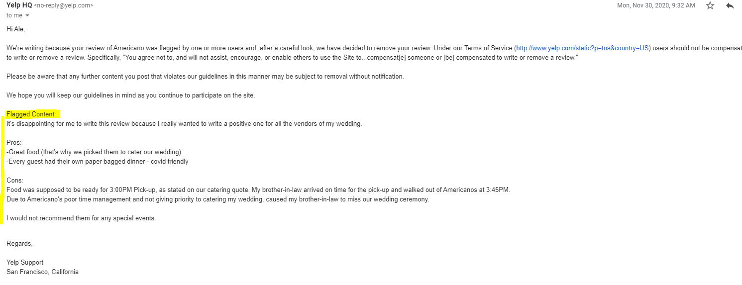 UPDATE: I had told Camila I would write them a review about this. She said that was fine and they wanted me to be honest and would accept the consequences of my review. Fair enough. I wrote a Yelp review for Americano's stating what happened. It was Flagged by Yelp and taken down. wonder who could have done that. I attempted 2 more times and was again, flagged and removed (pic attached of my 3rd attempt). So this so far is the only place I can share my review. That does not put them in a good light and shows they don't stand by their word. Nothing I said violated Yelp's rules about reviews. You be the judge. What upsets me the most about all of this is they didn't care this was my wedding, and said "we weren't a big...