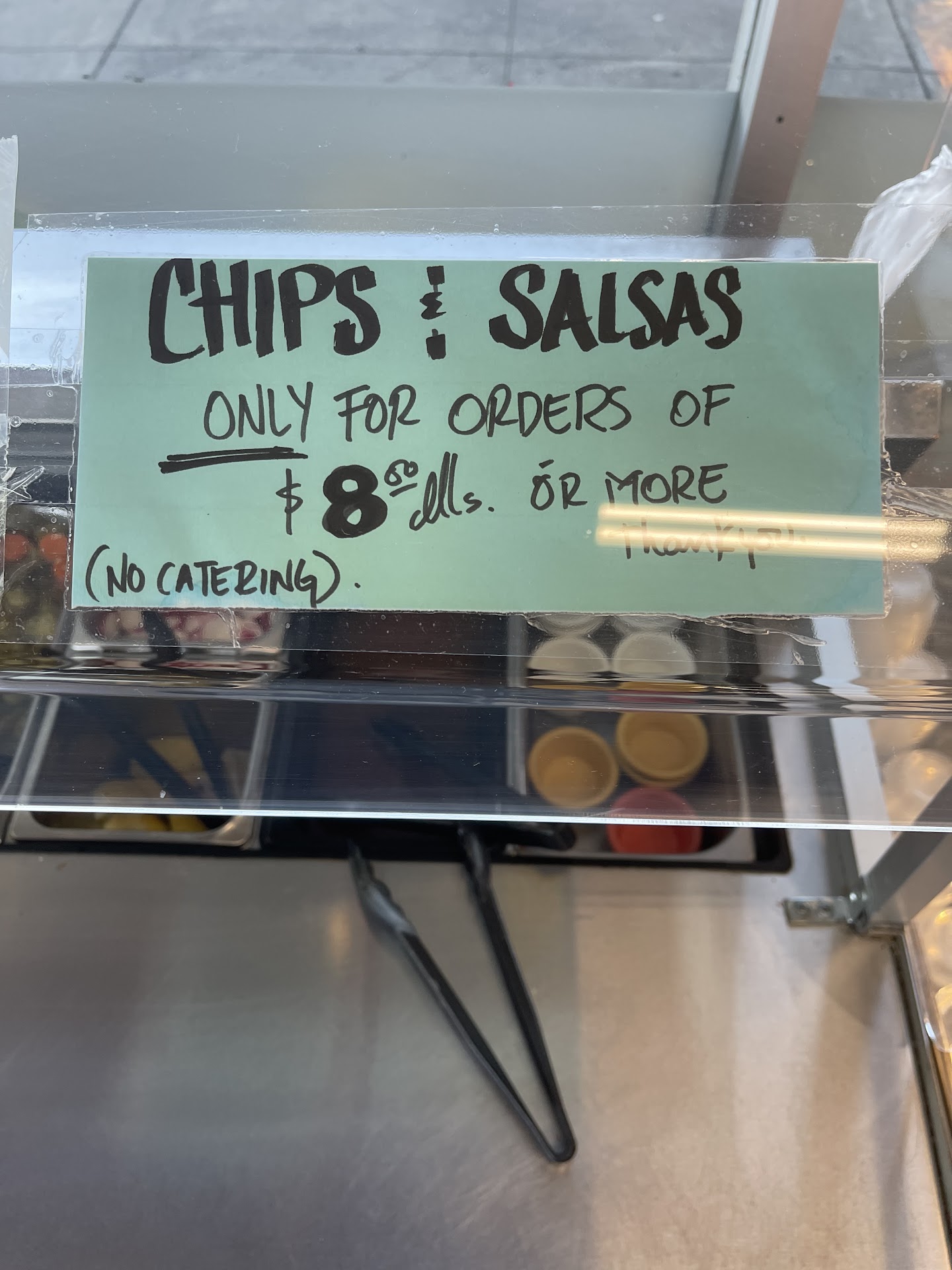I had an assignment to edit and had planned to do it as I ate. Unfortunately there were only (very tiny wobbly) tables available barely big enough for a plate, beverage, and the small bottle of Tapatillo next to the napkin dispenser, and it was too cold to sit at a larger table outside overlooking Railroad Ave and the strip mall parking lot, so I set down my soda on a ‘wobbler, and headed for the salsa bar in the corner.