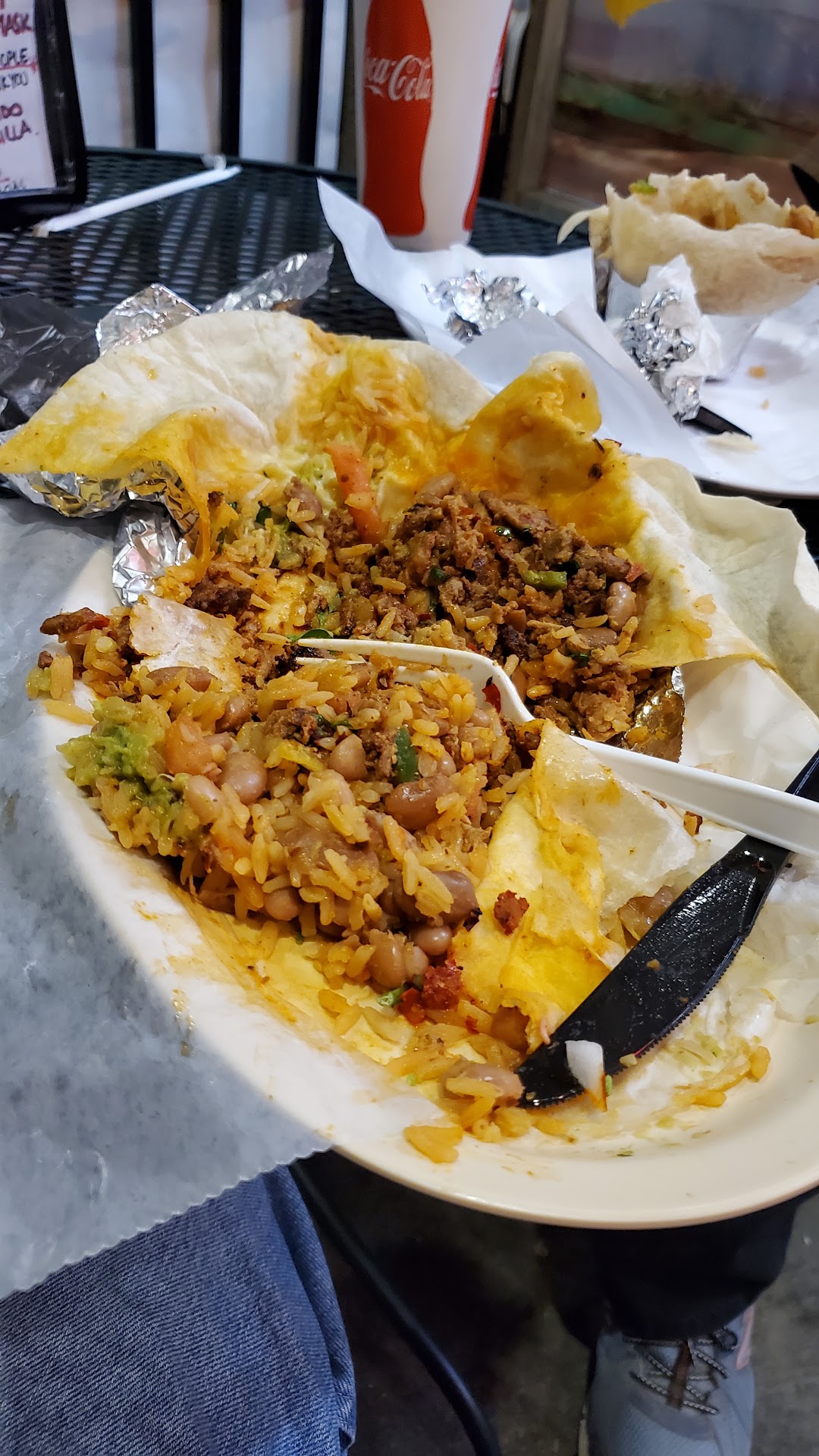 I heard a spatula flipping something on the grill as I chose my levels of heat, a couple of lime wedges, pickled carrot/jalapeno, and raw radish slices after trying a (stale unsalted) chip and deciding against more. (There was no cilantro or pico).