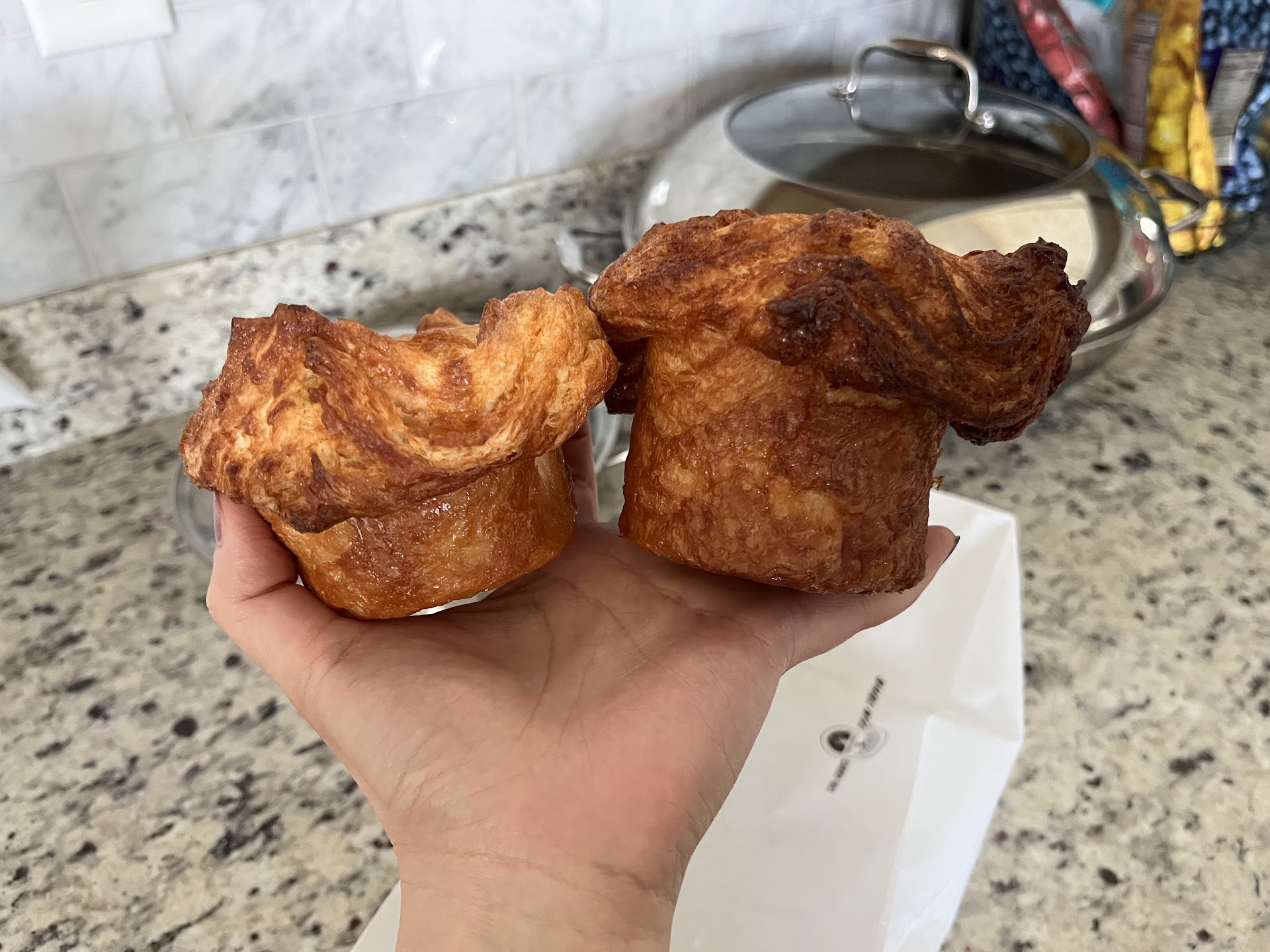 Chocolate eclair: almost inedible. It tasted so overbaked; crunchy and not in a good way, almost stale tasting, and there was barely any filling. Actually one of the worst eclairs I’ve had in my life, which at $8 I was kind of angry about, especially since eclairs are one of my favourite pastries ever. 0/10 would not recommend. Kouign Amann: still one of my favourite pastries but the difference from one to the next can be stark. See photos - both are plain Kouign Amann, and yet one is significantly smaller and misshapen compared the other, and the larger one is veering on burnt at the edges. Miso mushroom danish: I have had some that tasted like raw dough in the middle and made me feel a bit ill after eating. I considered reaching out but I hadn’t had issues with Simone’s pastries at that point and wanted to just support her, so ended up not saying anything. Thankfully recent danishes seem to have been baked well (though I also stopped purchasing them as frequently), but all these issues add up so I can no longer stand behind my previous rave review.