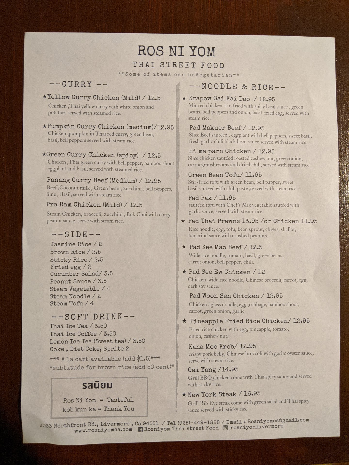 Ros Ni Yom rivals our favorite Thai restaurants from around the bay area. If you live nearby, you have a treasure. Otherwise stop in for lunch or dinner and you won't be disappointed in...