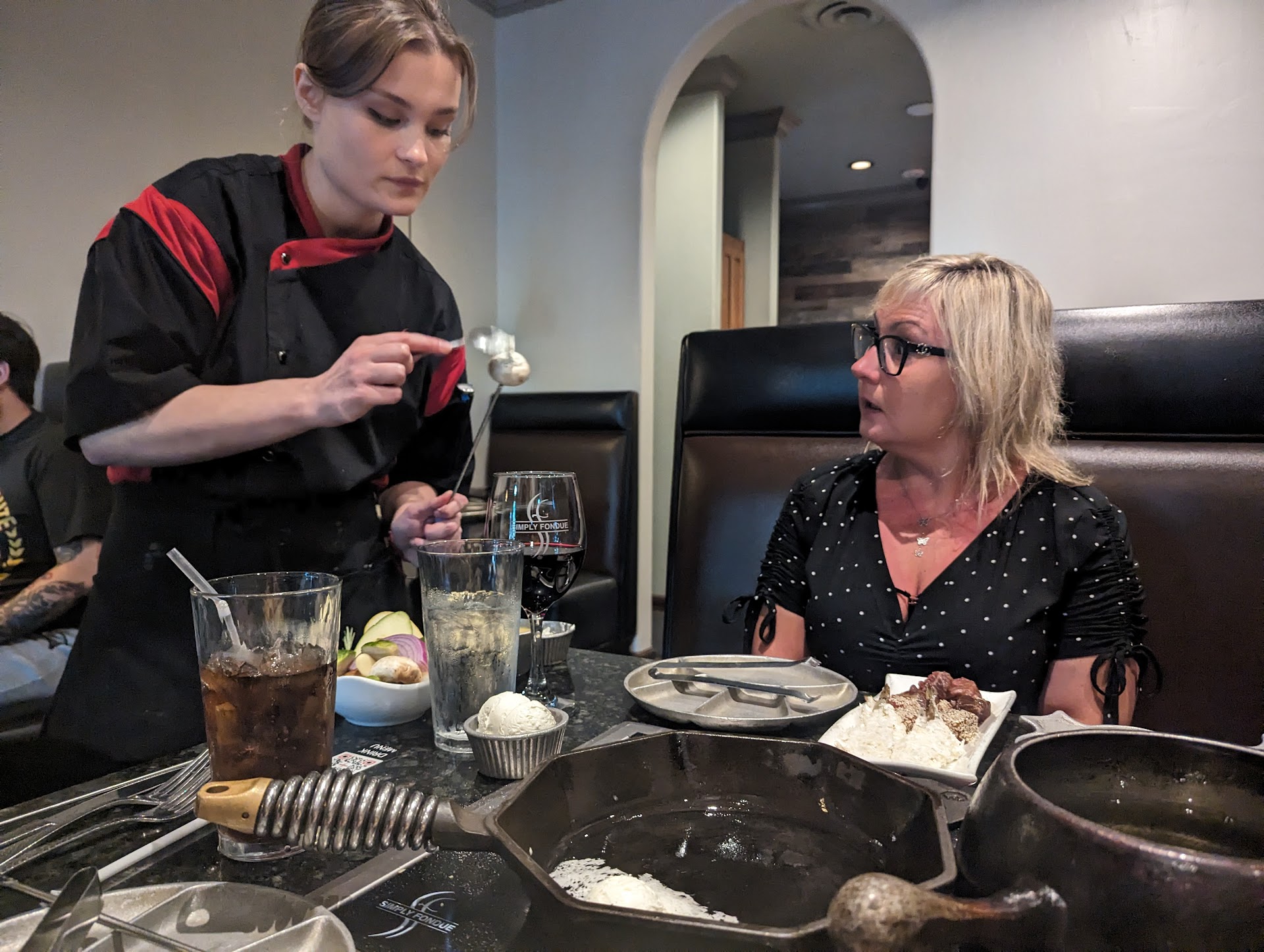 The waitress says we can order 2 chocolates with our Fondue Feast. When the chocolate arrives one is placed on our burner and one on the burner at the next table. A plate of desert dippers were set next to each. I notice that there are only 2 of each desert dippers, so I ask our server if we can have a second plate of dippers. She informs us that we already have another plate of dippers, it is on the other table (half eaten by the people sitting in front of it). She asked if I would like her to get it and bring it over. I told her that it was already half eaten and how awkward it would be to take it away from our friends at this point. I asked if she could please just bring one more plate since THEY messed up by putting it in front of our friends. She said no that we already got two. I explained again that we did NOT get two because they were not both placed on our table. It was like talking to a brick wall. I finally dropped it.