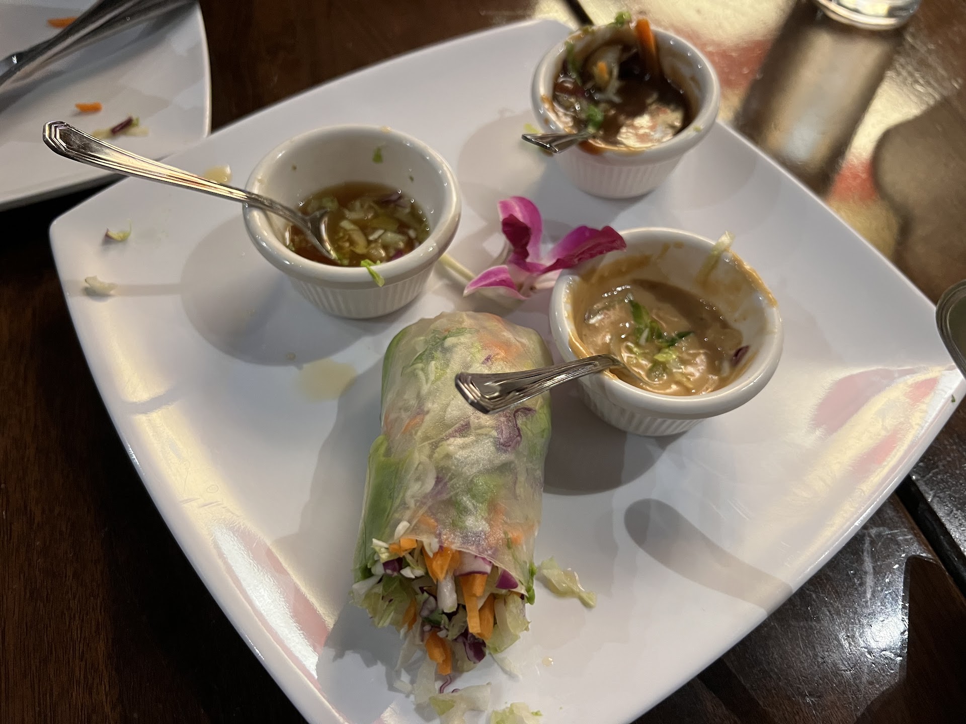 We ordered Thai fish cake for appetizer, Duck roast (from the grill) and Mango paradise (fried rice). The appetizer was good and cooked well, but it is not the conventional fish cake that you might think. Infact I would say it was fish-flavored cake. Duck roast was well cooked and had a good flavor. My most favorite part was the fried rice with pieces of mango in it, that really blended well with egg and chicken in the fried rice. All the dishes were beautifully decorated and I would give 5 stars for its presentation.