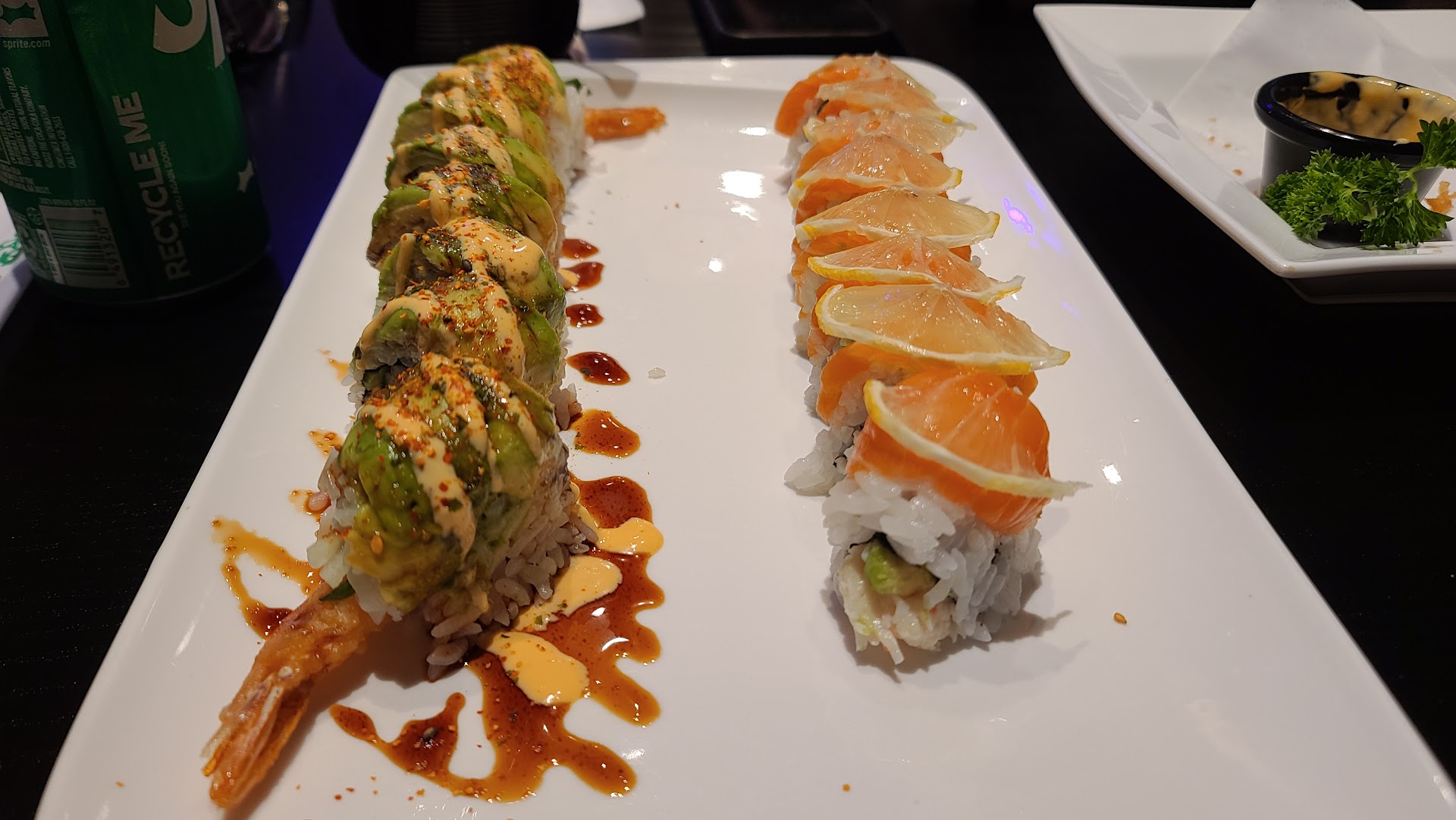 Unexpectedly good food! The menu is as usual what you expect from an usual California-located sushi place. (They have bento on weekdays). We got one cooked and one raw sushi. They put sauced imi crab on top of shrimp tempura roll -that is a nice addition. The multi-colored roe-topped sushi was a delight for the eyes and has a tiny flower for decoration -a nice touch. (See photos). When I looked closer to the sushi cross section, I was happy to see a larger part is fish, they didn't skimp on it. (More fish, less rice). The fish tasted okay.