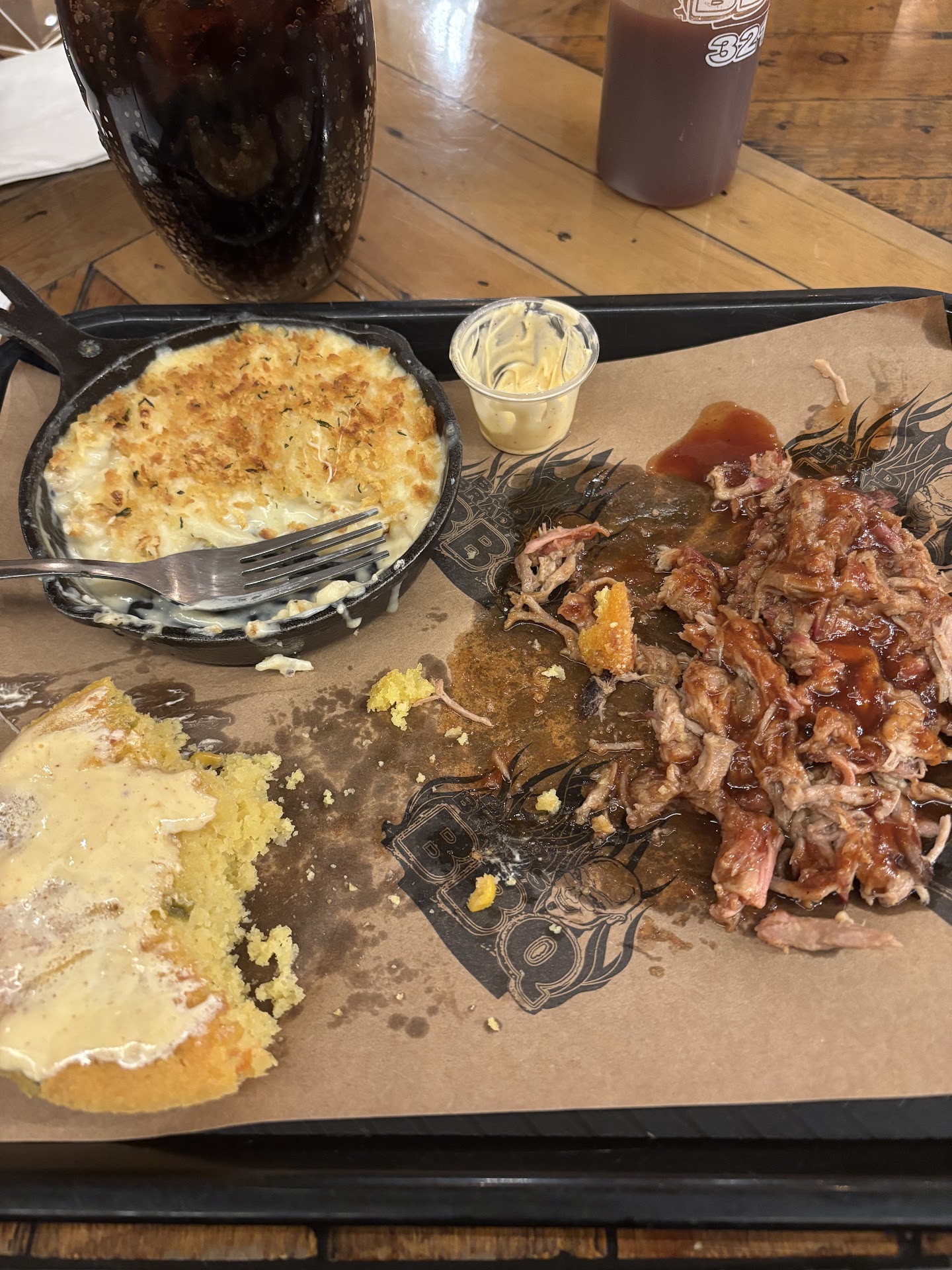 We enjoyed the pull pork- A good portion- LOVE the Mac cheese and cornbread 💜💜💜 I would like to top my Mac with the pulled pork and slather with sauce- REGARDING the sauce- we honestly could not tell the difference between the sweet , the barbecue 321, and the spicy- they looked different on the paper, but they all seem to have a very similar taste.-trust me, they were still delicious👵🏻❤️ The pulled pork was moist without being mushy. I wish I had a little bit more of a smoked barbecue flavor, but it was tasty. The mac & cheese is so ooey cheesy delicious- I could eat a large side of it- The cornbread was nice and warm, the right amount of moistness, sweetness, and the slight taste of the jalapeño-A little side of butter that they give to go with it adds extra deliciousness-