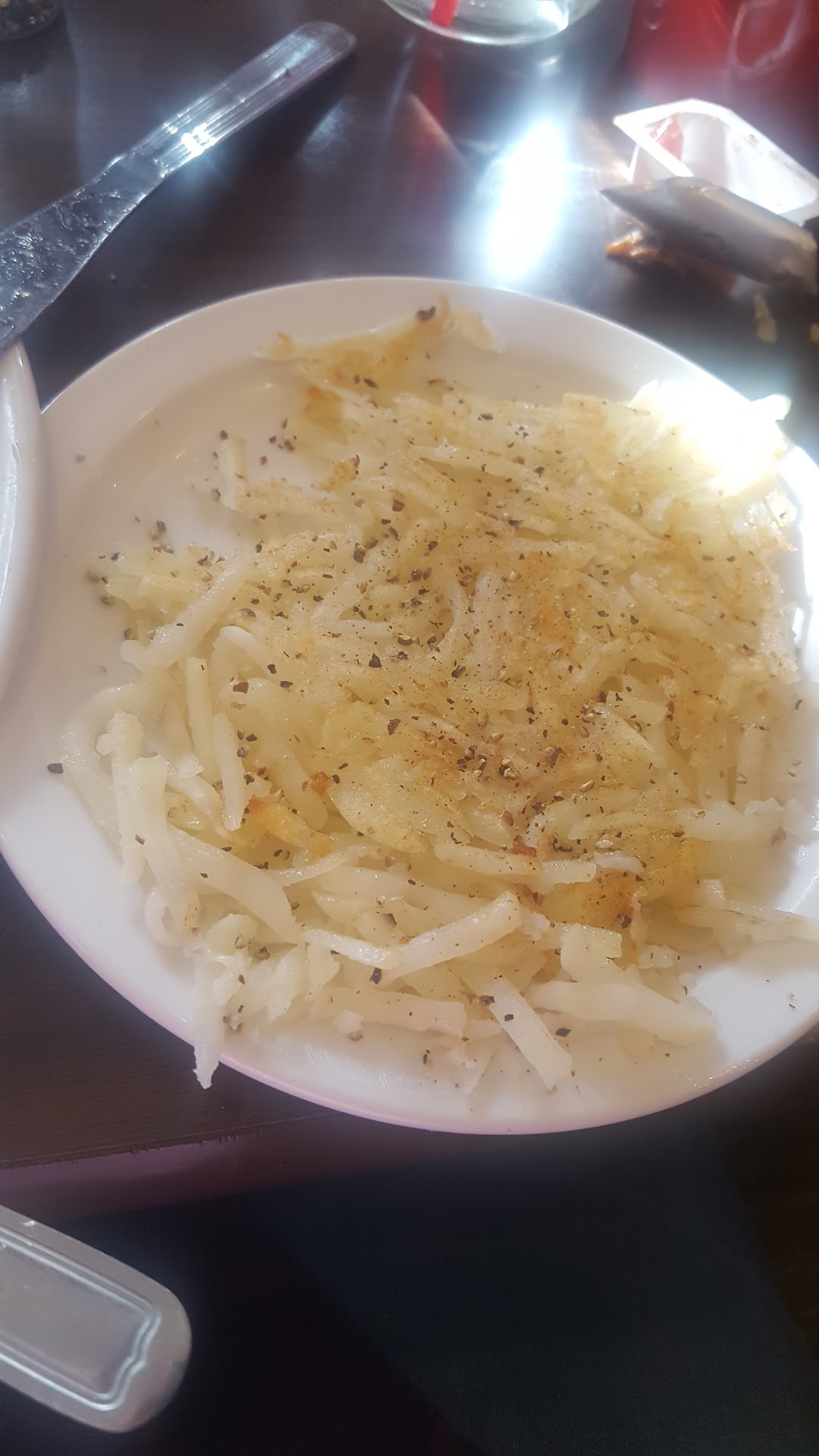 The young guy that sat us was helpful and nice. He stopped what he was doing to seat us immediately and looked diligently for the manager when we paid and asked to speak to one. We met our served 15 mins later. Our waitress was very bubbly and happy. Her friendliness was the reason I decided to get up and search the tables for creamer for my coffee and straws for the one out of two waters we did receive.