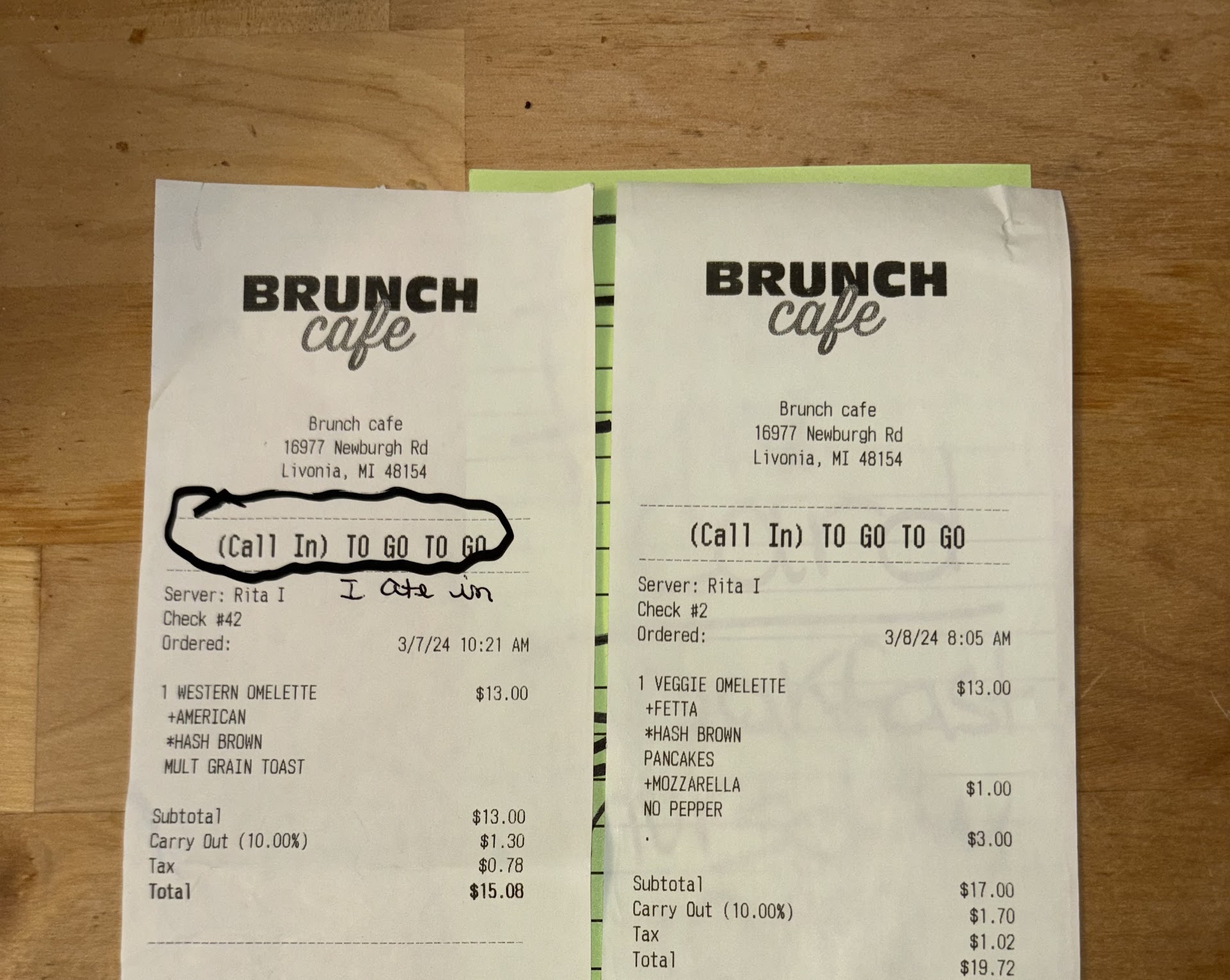When I got home, I looked at yesterdayâs bill compared to todayâs bill only to find that Rita gave me the wrong bill yesterday. My fault that I didnât catch it. I didnât order a Western omelette đ I ordered a veggie- and ate in. I didnât catch the error, yesterday-