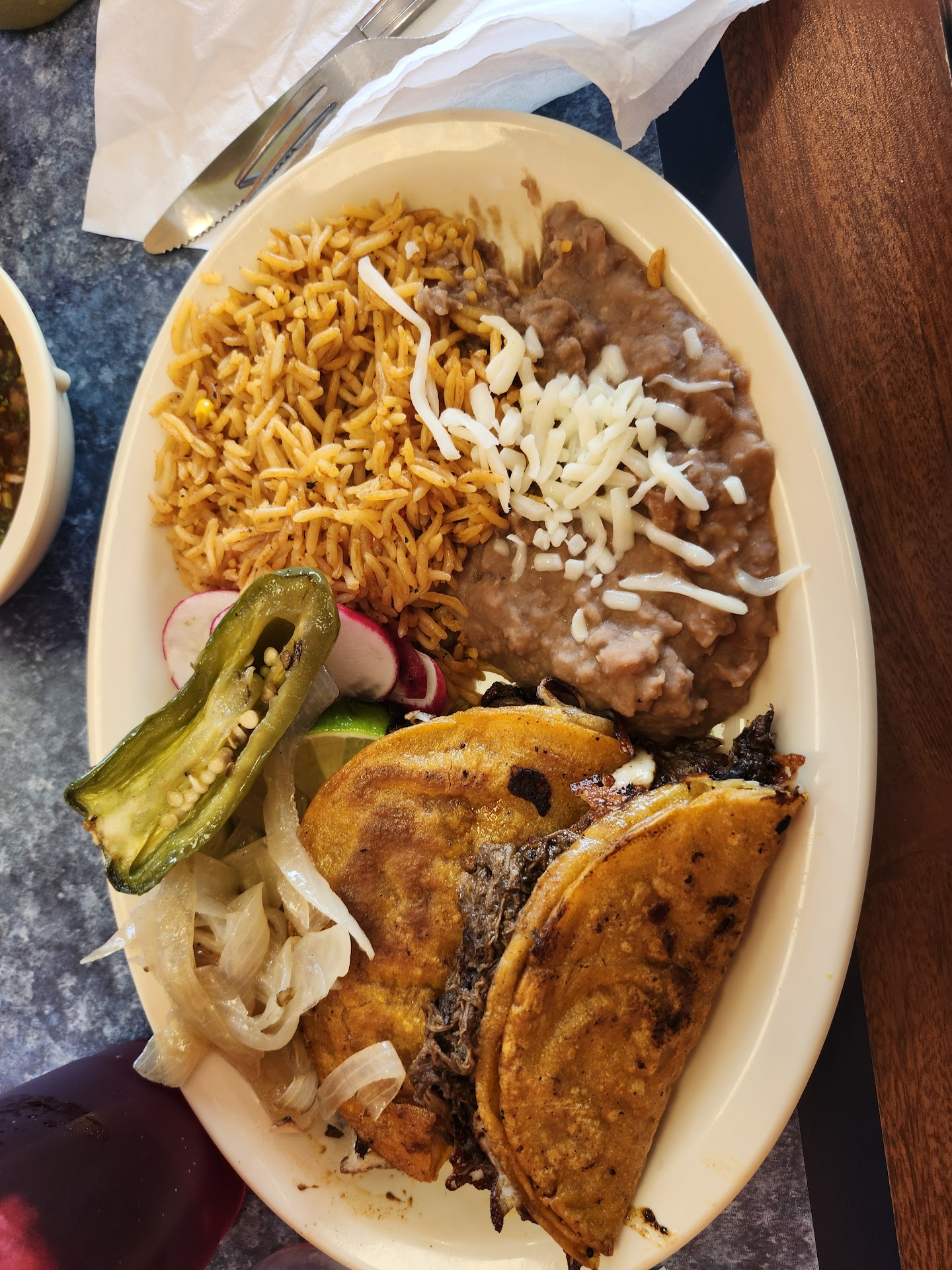 Good Authentic food! I have been a few times this summer and have never been disappointed! The Quesabirria tacos are amazing , it comes with consume❤️ the fajitas are also yummy. Those you can choose your protein, I have gotten the chicken and the carne asada both are excellent. My daughters love the chicken street taco’s, nachos (with ground beef) and the chicken quesadillas. Each plate comes with beans (black or refried) and rice. They offer horchata- aqua fresca and can/bottle drinks, and fountain pop. Also their Churros are just amazing!
