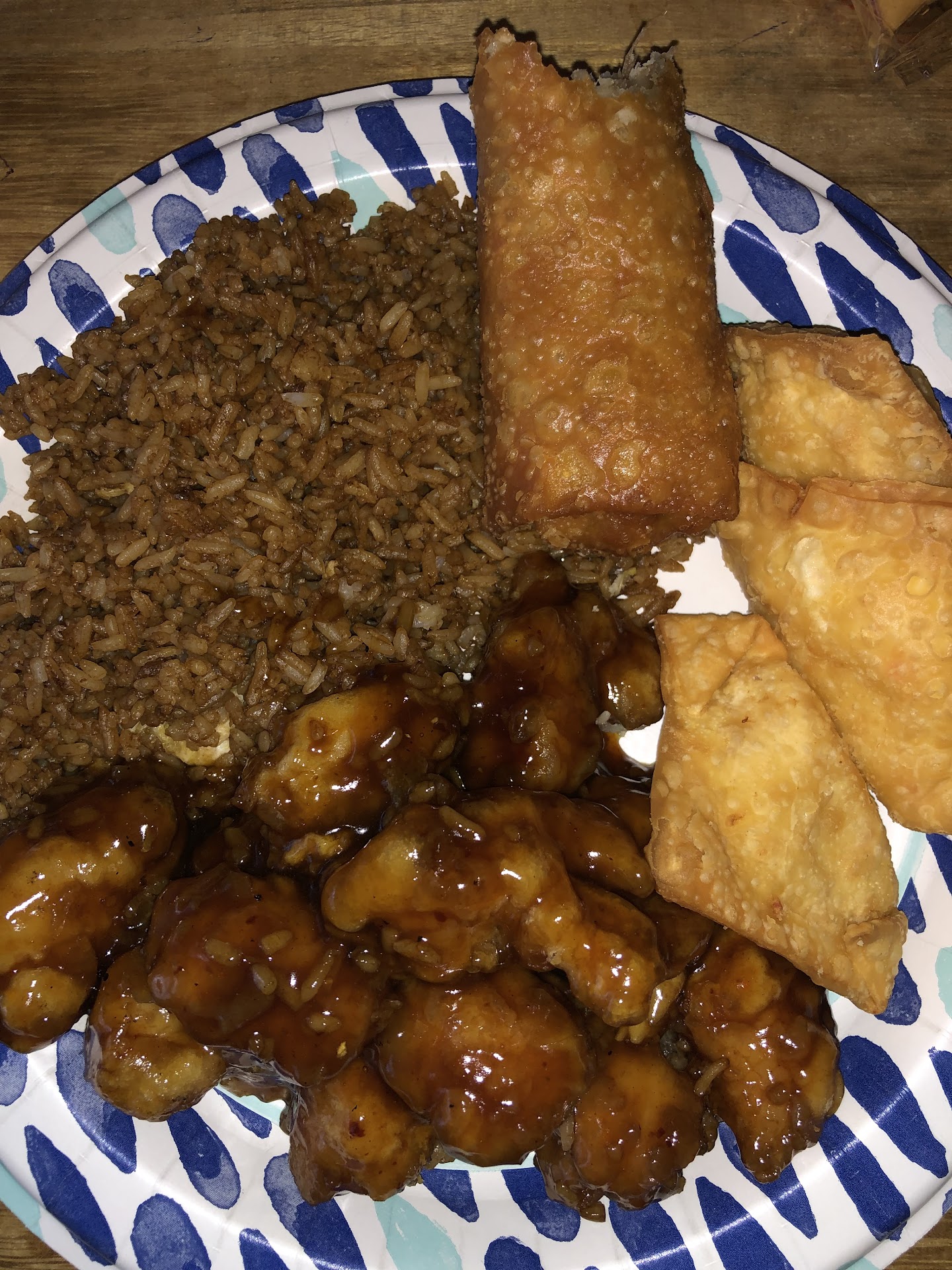 Fried rice was tasty and came as part of the combo- There were small pieces of chicken in the fried rice- Crab Rangoon was perfect! Yummy crisp spring roll- The egg roll was perfectly made. Not greasy, and it tasted fresh made