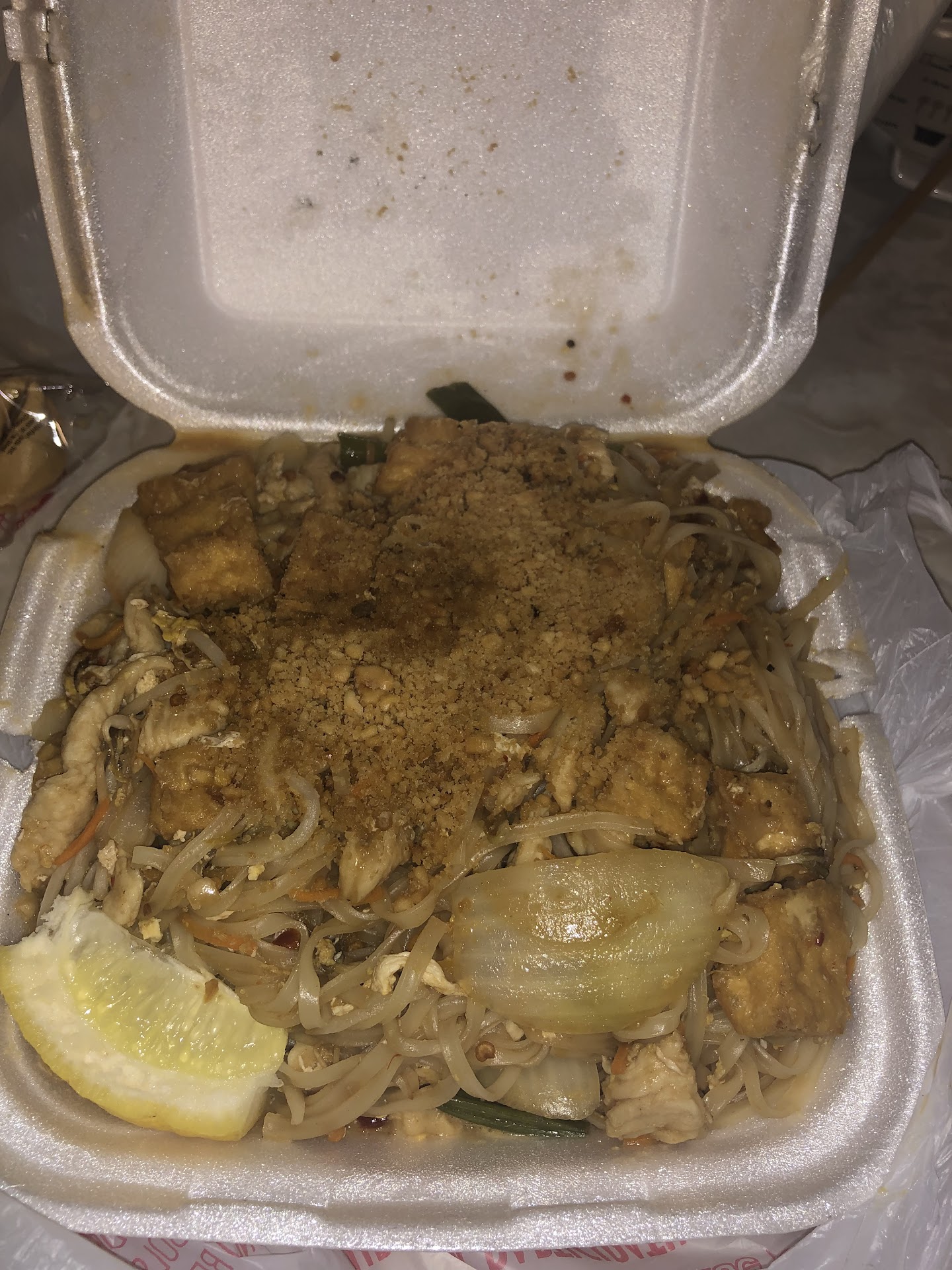 Today we shared the chicken pad Thai with extra egg and added fried tofu. They made the dish perfectly. This was our first time having it and yes, it’s more of a Chinese version of pad Thai I didn’t care for the large chunks of onion I prefer the green onion. The sauce was semi-sweet, but not over the top.