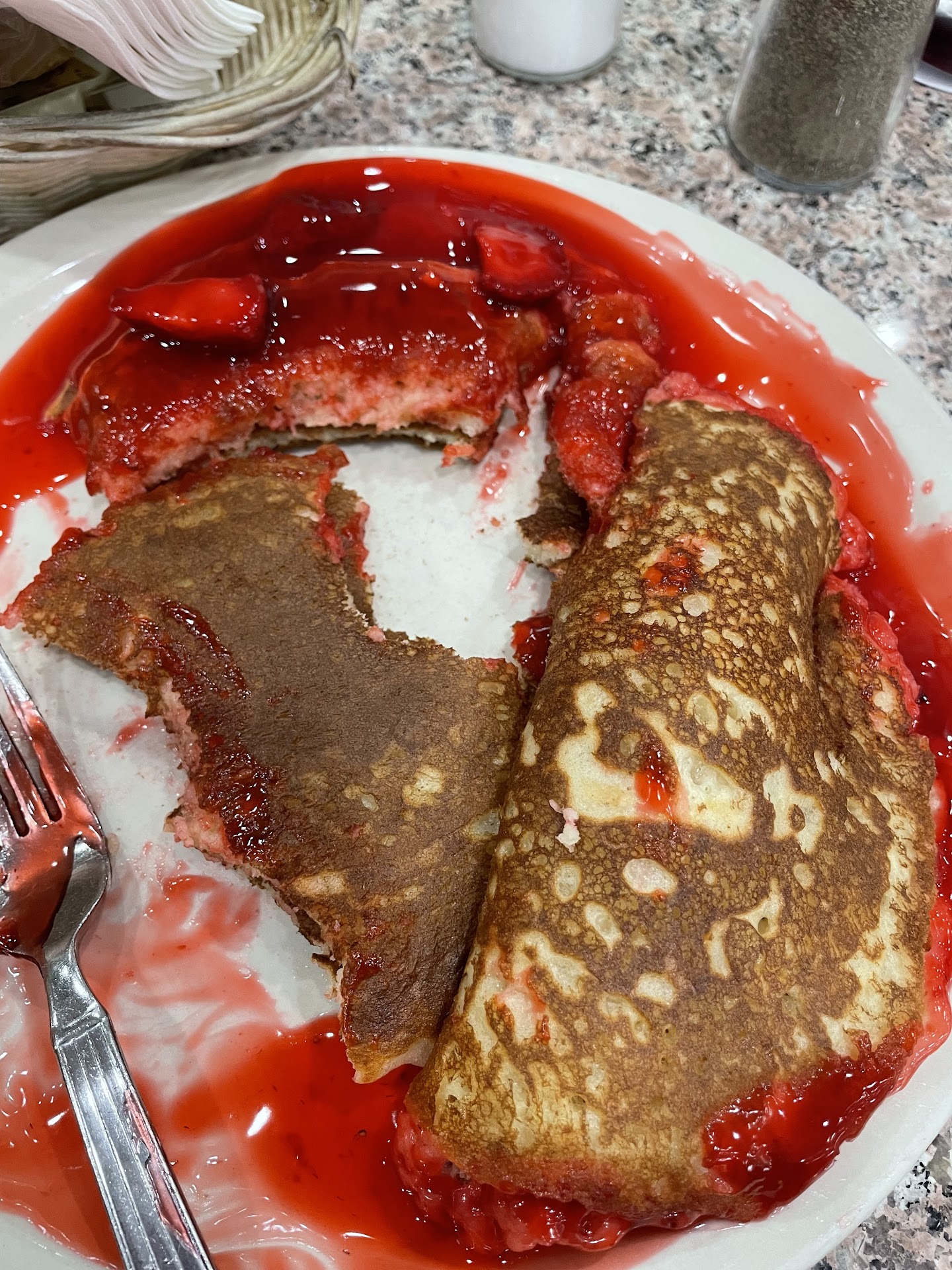 Ā Ā Ā Read moreSo I visited this place with hope in my heart. An acquaintance of mine took me there for breakfast and it was not the most comforting experience. We were seated by a man who did not make any eye contact, pointed in the direction of the table we were to be sit, and he slapped the menu on the table. That set the tone for a very awkward experience. He asked in a very dismissive tone if we wanted one coffee or two, as if we were disturbing his day or something. Anywho the woman comes to the table and asks if we know what we want order, neither of us were ready and she offered to circle back. She then continues a very dismissive conversation with another table about how slow the kitchen is, to justify the duration of their wait. She then comes back, I ordered waffles and before my acquaintance could speak, she says āYou canāt order that after 2 o'clock.ā š¤ they had two prices on the menu $7.99 for before 2pm $8.99 for after. But anywho I then order French toast, āWe donāt have that or biscuits or sausageā , in a very stern tone as if Iād been coming there my whole life. āOk..ā I respond and then she says āWe have pancakes.ā I didnāt want pancakes but to make the moment less intense I said, āSure Iāll have the Strawberry pancakes.ā And this is what she brought me. Overcooked, strawberry sauce smothered, very underwhelming plate of what tasted like slop! Because my acquaintance was paying I tried to be nice and respectful but this was disgusting. I do not recommend going here if you are looking for a family experience because they seem like an exhausted and uncaring...