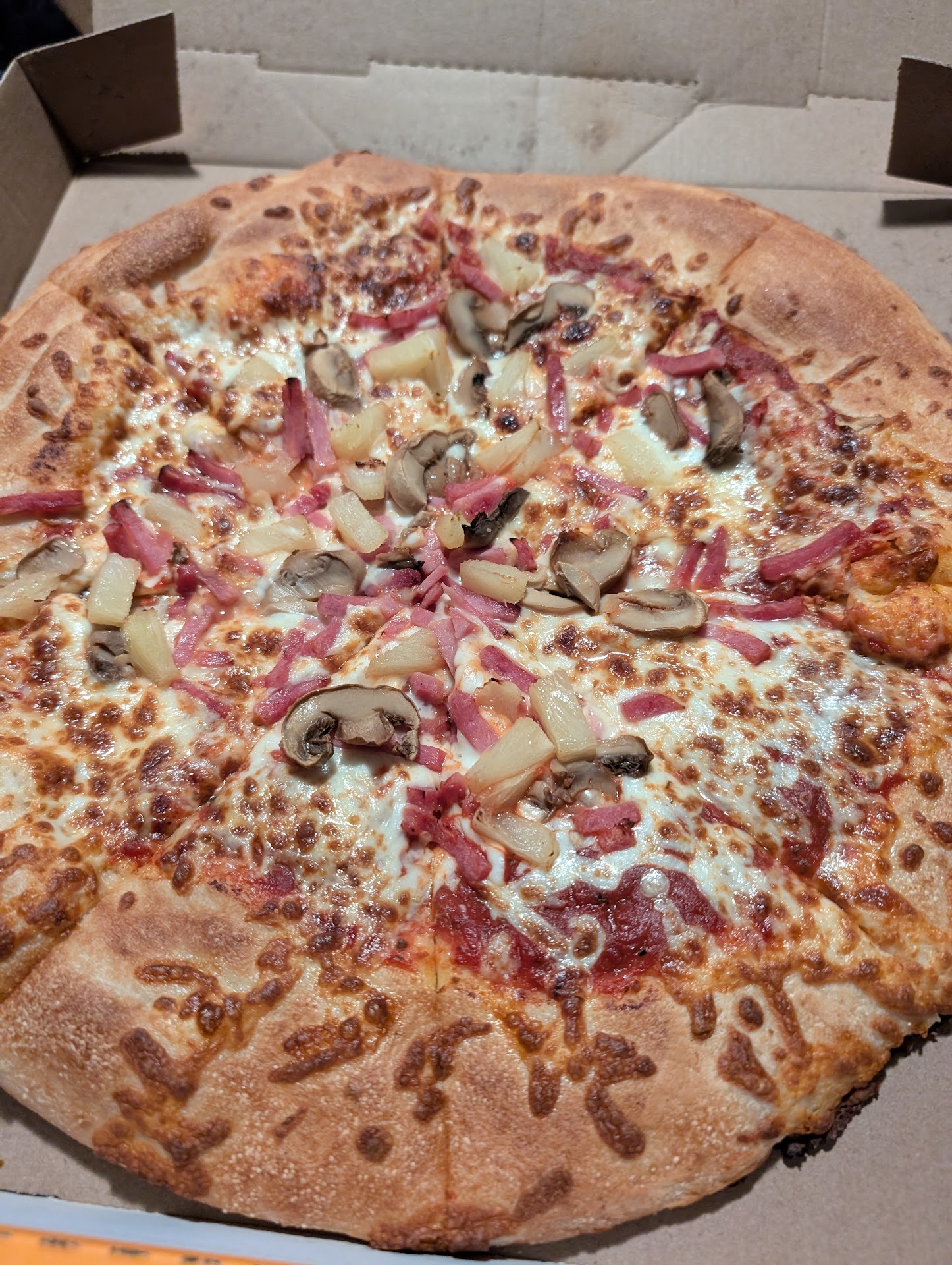 Edited from 3 to 2 stars: this is the latest pizza we got. We actually drove back and swapped the pizza because it looked so poor. Staff clearly donāt put any care into their work, toppings arenāt spread evenly, pizzas are over handled when put in the box out of the oven so cheese and toppings slide all over, and pizzas are often cut poorly. This last one Iāll give them the benefit of the doubt that they were cutting for a slices and sticks pizza as opposed to a half cheese half pepperoni pizza. But someone still messed up and chose to serve this to the customer.