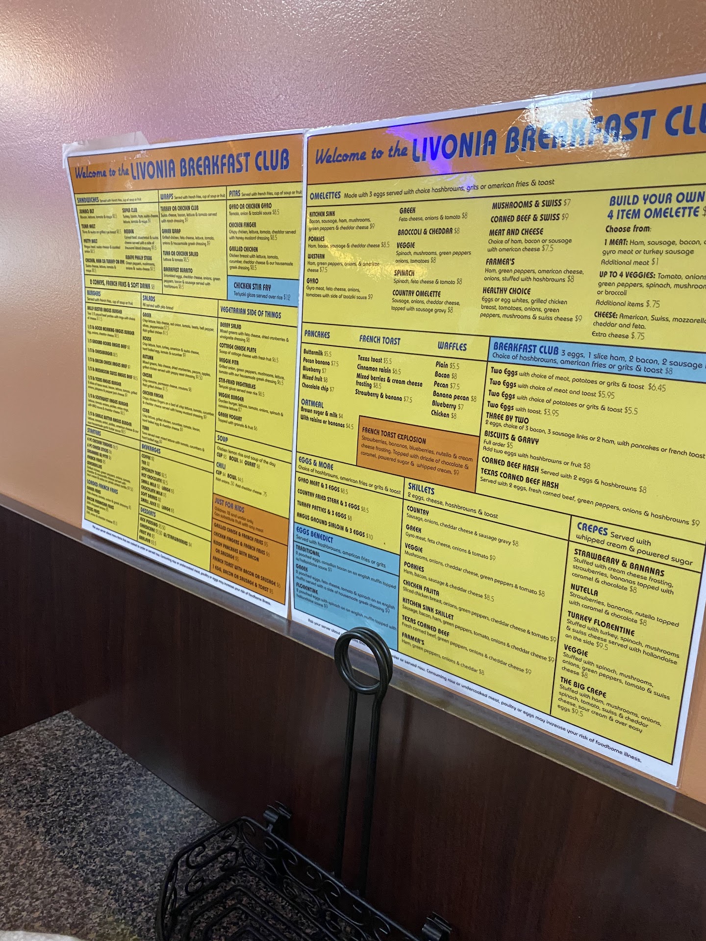 Read moreBeing that this Restaurant is next door to the Livonia SOS Super Center. Me and my wife decided to have Breakfast while waiting on our number to come up.I was supprised to notice not many people were in there from Secty of State. My first distraction that I noticed was a half of a toast under the table before and after we left. There were only 4-6 customers there during Lunch time. The waitress was okay. I could hear her correcting the Cook, who is also the owner several times on our order.I guess that was the first sign to Leave. The Cook began to get Loud with the poor waitress when he was the one who made several mistakes, trying to blame her. Being the customer,I should have never been able to hear his Rudeness. When the food finally came I was not pleased. I ordered a chicken fajita scrambler and it was extremely greasy and my pancakes was Banana Pecans.The waitress had to to tell him several times. Normally, the bananas are cooked in the pancakes but he decided to put them on top.The waitress went to ask the Cook if he could take the pancakes off of the bill and he said no and refused. So, I can see why his business volume is extremely low, 4-6...