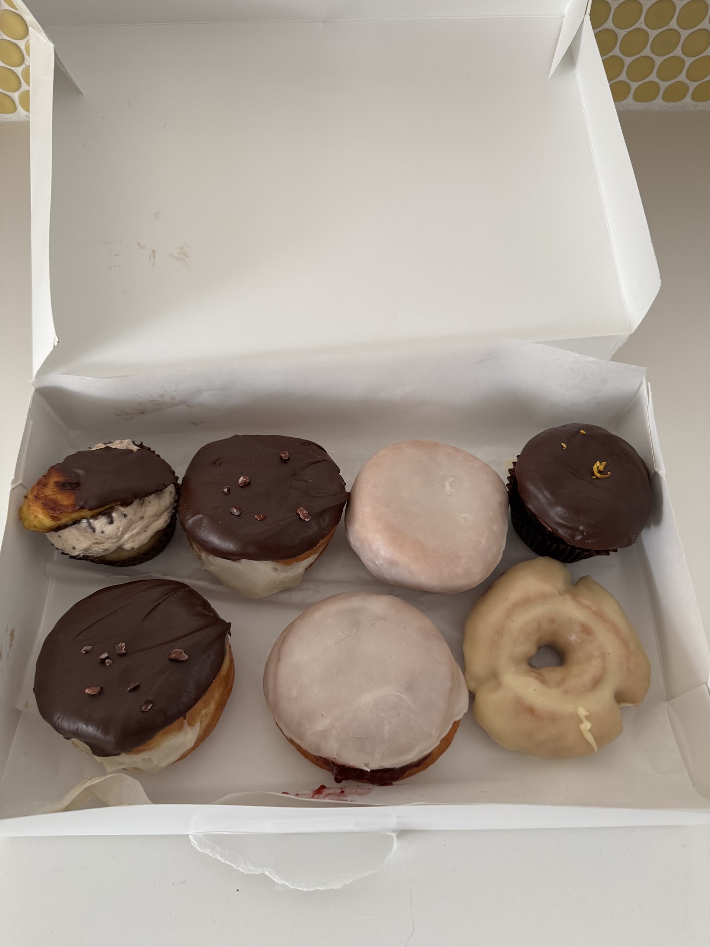 The flavor options and variety Toi offers are out of this world. I tried so many different things and loved them all. I got both cake and yeast raised doughnuts, cupcakes and paczki's. Every single thing was delicious. The cake doughnut had such a moist texture and was not greasy. The passionfruit lemon icing on it was also perfection; it was sweet with just the right amount of tartness. The yeast-raised Bustin Creme was fluffy, filled with the most scrumptious vanilla and topped with a heaping helping of chocolate. Paczki's were not dense and had a nice airy feeling, they were also filled with a very generous portion which I definitely appreciate in a paczki. The chocolate sweet plantain cupcake had great texture and flavor. I loved biting into the cake, soft plantain and hard chocolate on top all at once. It was divine! And last, the chocolate orange whisper cupcake was chocolate heaven. Choc cake, choc buttercream and choc ganache with a light twist of orange. I love chocolate and this nailed it!