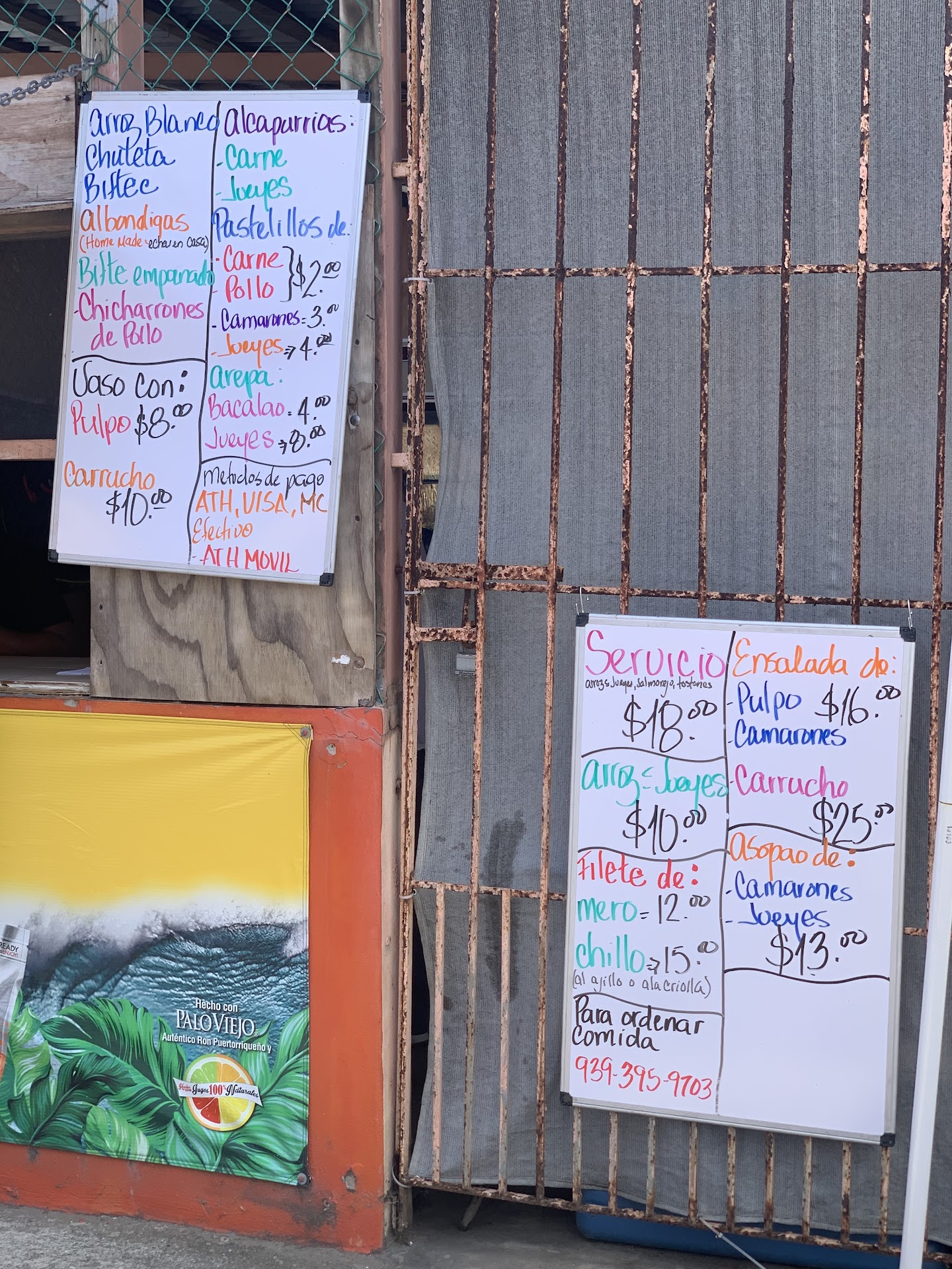 Read moreProbé el Mofongo con "Churrasco" que ordenó mi hijo. El plateo estaba presentable. Al verlo cortar el "Churrasco" me pareció verlo sin fibra y suavecito como si fuera Biftec. El me dio a probar un pedazo. Lo encontré salado. Ademas sabía mucho a Salsa Soya. Nuestros comensales fueron, entre adultos y niños, 11 en total y todos le encontraron falta a algo. Mi ensalada de carrucho estaba buena. Los tostones no los sentí crujientes. La salsa para acompañarlos me gustó. El envase donde lo presentaron se tapaba y ya se podrán imaginar. El arroz con jueyes y salmorejo de jueyes tampoco ganó estrellas. El chicharrón de pollo también estaba salado. La pasta penne en salsa alfredo no le gustó a una de las menores que es amante a las pastas. Yo lo probé y lo encontré al dente. Salsa se veía aceitosa. La ensalada de carruchos de uno de los comensales era mas ensalada verde que de carrucho. Probé pastelillo de Chapín y me gustó. La piña colada también ganó estrellas. Lamentablemente empezó a llover y como el techo es de zinc, entre el volumen muy alto de la música y el gotereo se nos arruinó aún más la primera visita para mí. Aparte que con el viento de los abanicos, las servilletas se iban volando. Una de las comensales pidió repuesto pero se tardó demasiado en llegar. Usé el baño de damas y no estaba limpio. El estacionamiento, al no ser embreado, se enfangó. Los precios son bastantes competitivos. Ah, mas la tarjeta de crédito "se desapareció" entre las carpetas que no tenían identificación para diferenciar las mesas ni bolsillito para colocarla a los que preferimos pagar...