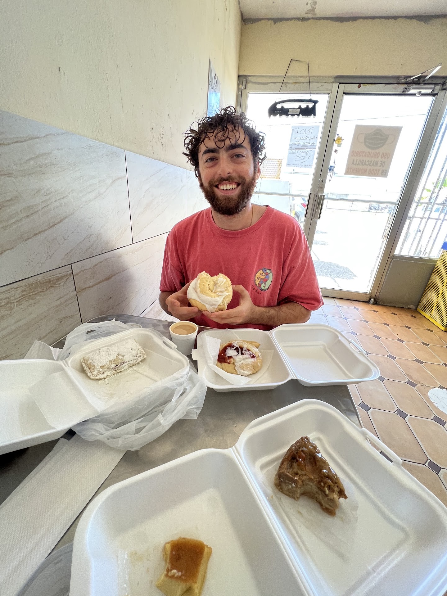 If it wasn't because of a picture of the front of the bakery on Google we would have almost missed it because they don't have a sign with their name. I am guessing it was due to Maria Hurricane. And I'm glad we stopped here because el pan sobao was delicious. We have the scrambled eggs with ham and toasted butteres pieces of pan sobao. Delicious. We also got a tostada with queso de papa. Amazing. Will def recommend to stop by and eat here if you...