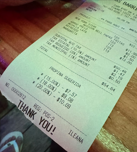 Read moreDecided to stop by and grab some food with my boyfriend, first of all they had us waiting there for a good time and we had to look for the waitress to ask if we could be sat. Food was very good, we got Arroz con pollo (rice with chicken) and Steak with fries. We also got some drinks, the only bad side of all this was the service. The lady looked like she didn’t want to be there at all , forgot about our drinks( it took 20-30 minutes to get one coke and one medalla), did not check on us one single time,and when we ordered a margarita towards the end we let her know that we didn’t like it because it tasted very sweet, it literally tasted like straight lemon juice, and politely asked her if it would be possible to return it since we had only take two sips of it,she just said there’s nothing she could do and that we had to pay for it regardless that it’s not her fault but the bar’s, she didn’t even try to look for a solution or help us out nothing. It’s important to mention that at the time we were there the restaurant was pretty much empty, there might have been only two other tables and the waitress was either nowhere to be found or sitting in a table using her phone. So at the end we ended up paying for something we didn’t even consume and no effort to help out was shown from her part at all. And she still had the audacity to ask us for tip! I work in the service industry so I know better than most people the importance of giving good tip but also to provide and deliver good service as well !! And unfortunately this establishment did not do it. Good food but not recommended at all if you’re looking for...