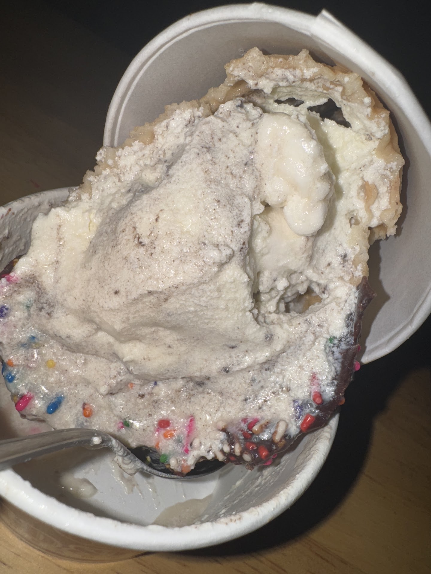 I got the Oreo cream ice cream with marshmallow mixed in for the heck of it, in a sprinkle dipped waffle cone. It was so bad. š Iāve never threw a whole ice cream away until now. The ice cream was powdery and nasty. You can even see the texture a little in the photo. I gathered that they use the whole oreo in theirs instead of just the cookie part, but I hope they reevaluate. Disappointed, i took a big bite into the cone hoping it would make it a little better. It tasted cheap, thin and way too sugary even on the plain parts. I could tell that the chocolate and sprinkles are the cheapest they could find to use. Before i ate the ice cream i brought it straight home and put it in my freezer sealed tightly in the container and it did not harden at all. This tells me that the ice cream is very high in sugar and fat, or that itās just cheap ingredients used. I spent $10.12 on one ice cream to have this experience. Just go to Dairy Queen. Or Jewel and grab a Haagen Dasz for half the price and 10x better quality.