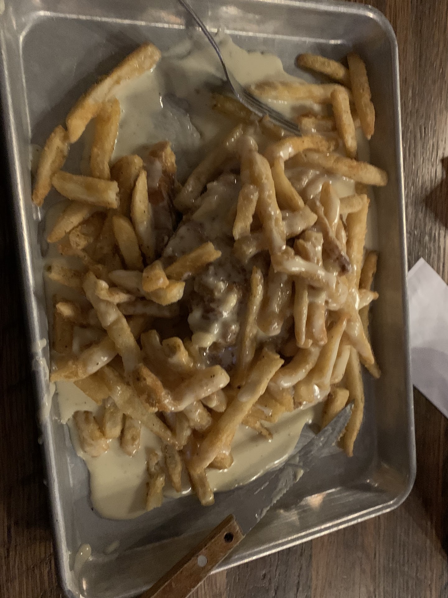 We were greeted by our server, and after a few moments, decided on our Horseshoe: a thick cut of Texas Toast, topped with my choice of meat (pulled pork) crispy fries, smothered with a house-crafted cheese sauce. We also opted for a side of beer battered onion rings. Both items arrived in less than ten minutes and were full of flavor. For the price, I think the portion size could have been larger (when compared with the genuine article in Springfield), also $2.50 for soda is a bit much, though it is served in a metal cup which is quite refreshing.