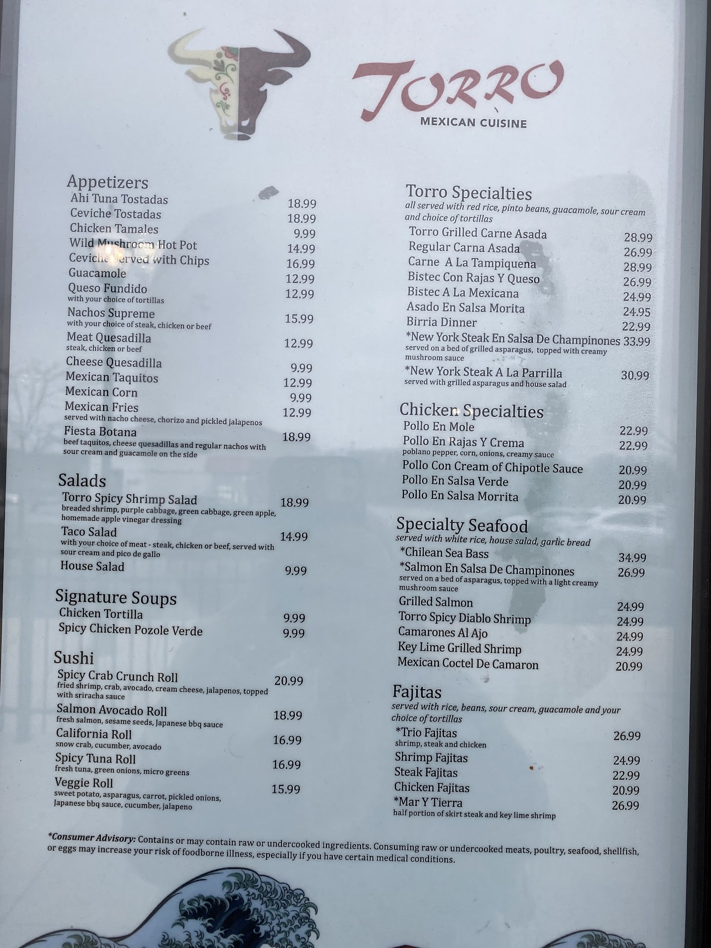 Read moreMy husband and I met some friends for lunch in February. I suggested Torro based on some of the reviews I read - I should have continued reading more reviews before I suggested trying this place. We were the only table, but the service was slow. We all ordered off the lunch menu and for the price the portions were on the small side; my husband and I usually bring half of our lunch home from other restaurants because we're full, but this time we ate everything and I was still hungry. The food was mediocre at best. I had enchiladas and they had no flavor, the beans and rice were cold. One of our diners had to get up and get the server's attention to get the tortillas that came with a couple of fajita plates. Actually, only one person liked their food, but also said the beans and rice were cold. The only positive note was the drinks were decent. The server, apparently, was also the bartender because she was more focused on mixing up gallon jugs of sangria, margaritas, etc. instead of checking to see if we needed anything. We've had far better carry out Mexican food from El Burrito Habanero on State Street and La Michoacana Del Valle on 159th Street. I'm pretty sure this will be the only time we...
