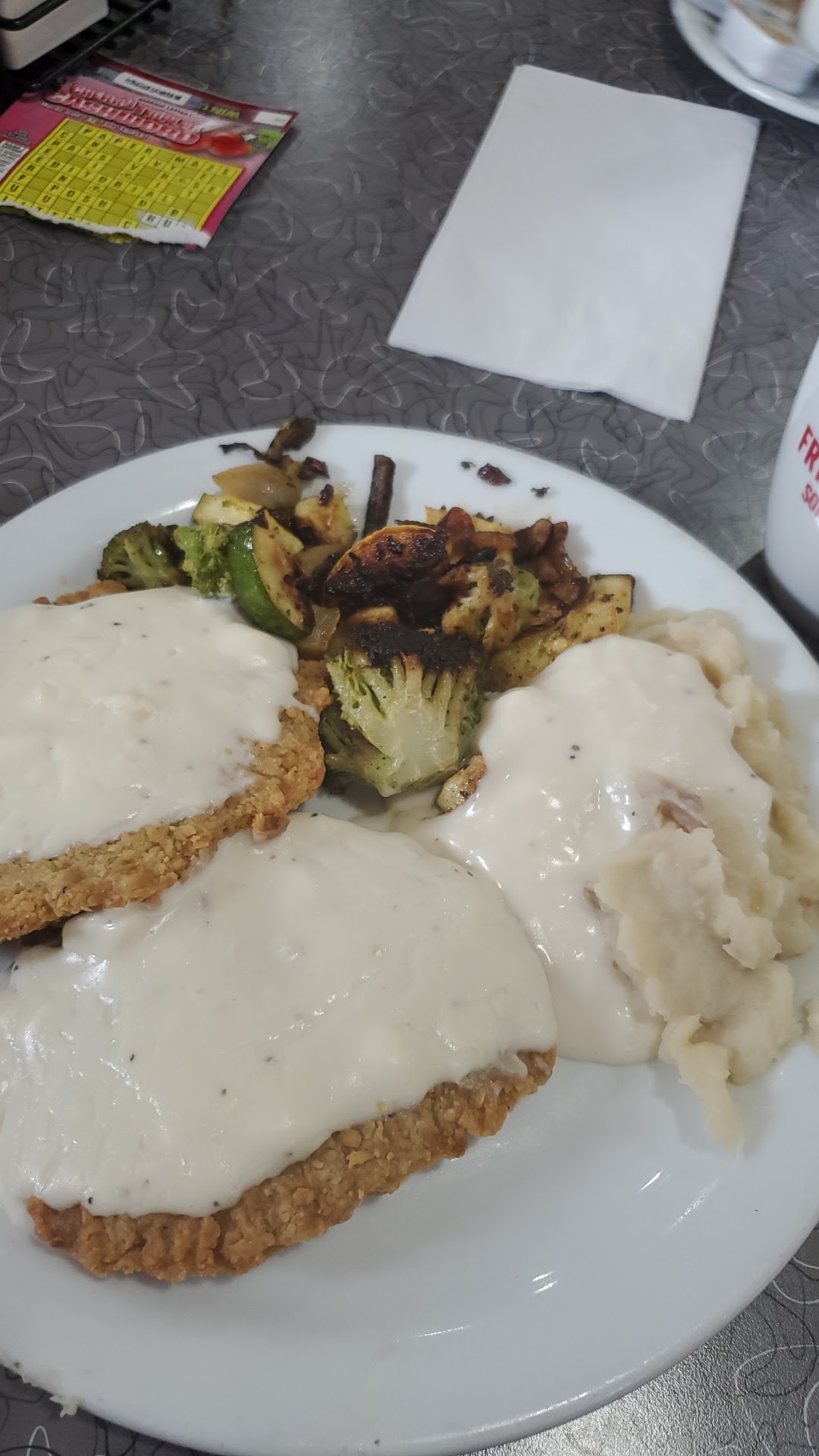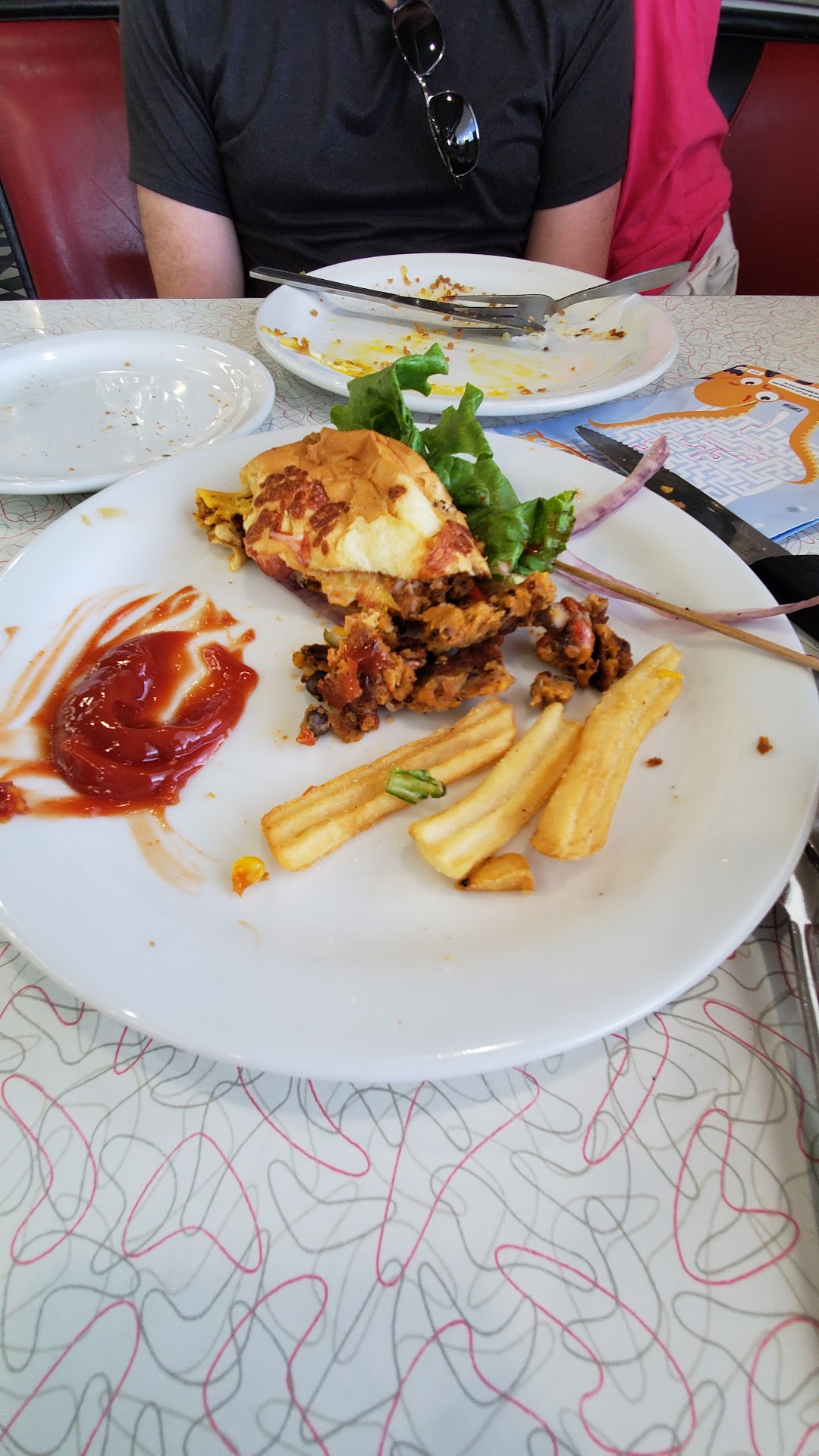 Read moreSuper excited to see a Denny's on our road trip since we hadn't been to one in years. Bonus, it's the old style chrome diner Denny's. We were sat relatively quickly, in spite of a steady stream of customers coming in. Our server was nice and friendly. The restrooms were a little gross and the sanitary boxes in the ladies room were overflowing. My husband got the Coubtry Fried Steak breakfast. He said the CFS was great the first few bites, then was a little rich and greasy. But that's what a CFS is, right? Lol. Overall his was good. My daughter had the spaghetti kids meal with a salad. The salad is just lettuce in a bowl with croutons. Still, they were premade in a cooler - you could tell since the croutons were cold and stale. My 5 year old didn't say too much though...just asked why there wasn't as myth in ng but croutons on her "salad" since the picture had cucumbers. Steer clear of the veggie burger. The party was absolutely disgusting. It was like warm mush flopped on a bun, and literally felt out of the bun in chunks when I picked it up. The taste was off, and it was like a creamed slop with no shape or consistency. That was disappointing since the cheddar bun I picked was super tasty, all the toppings were fresh and crisp, and it otherwise would have been an amazing veggie burger. The fries were decent too. I asked our server, and then the manager, if there was anything they could do about the check since the veggie burger was so bad. The server was nice ed and got the manager. She said she couldn't take it off, but she could discount it. Which is fine...I did eat half the bun (we'd been drivin GB for hours and I was starving). I just didn't want to pay full price when I was only able to choke down one bite of the patty. I did eat the fries too. They weren't super special , just basic good diner fries, hot and crispy.
