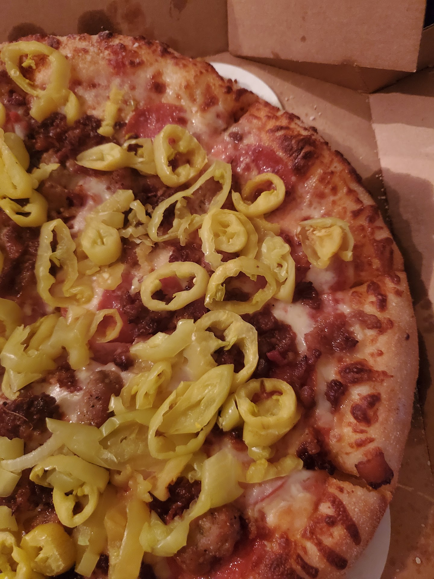 Driver hands me my food (out of the bag when I open the door, with napkins on top of it and a part packet on top of that, loose (?), and says "here you are". OK. I take it inside, ask for a pen and he hands me his phone to sign, which was cool, and then says thanks and walks away. That's about as lame a delivery as you can get. No please, thank you, call me by name, etc. Whatever. So I go inside and notice my sauce cups are missing, and one side of the pizza (without the old world peps) has a total of 5 peps. 4 1/2 actually if you count the one that was half into the other half of the pizza. The other half has tiny nickel sized shriveled Peps all over it, but still, Strike two.
