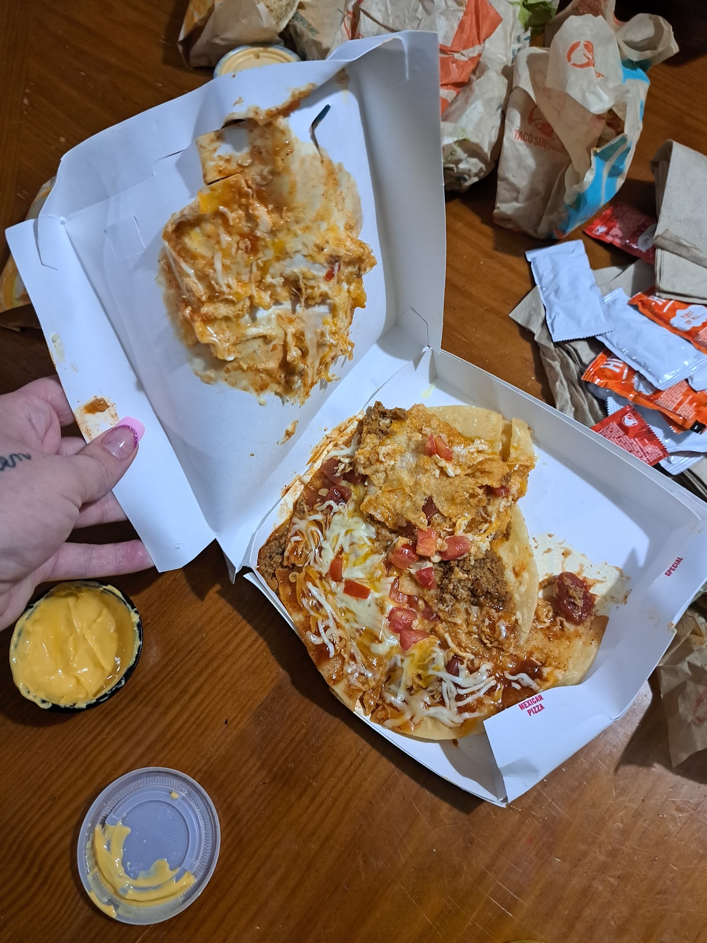 This taco bell is the worst! We should've quit going a couple of months ago when we placed a mobile order and got to the restaurant and were told by the two employees standing outside smoking that they were out of everything and to request a refund. The app wasn't letting us request one and she informed us it would take a couple of days to get our money back. We told her we spent the last bit we had to feed our kids after a day of traveling and now we have no food. The other employee then says ok I'll make it. Magically they were able to make out entire order as we stood at the counter and watched. Then today I place a mobile order. The app says it's ready right before I pull up to the restaurant. I go in and they act like they already gave my order out. They ask to see my mobile receipt. They take pictures of it and proceed to make my order. When they give it to me I checked to make sure everything was there(shocker it was missing items) but I didn't really check the quality. They give me the missing items and the drink substitutions to the drinks I ordered since they wereput. I get home and the food is not only cold but sloppyand unappetizing. The Mexican pizza box is smooshed and the rubbery pizza is stuck to the top of it, the Burritos aren't even wrapped up, the hard taco had everything on it that wasn't supposed to be and it was broken into pieces, and to top it off one of the cups of cheese for the chips was eaten out of!! There was a tint bit in it and you can see the lines in it from someone putting their chips in it! We tried calling the store several times with no answer, called the corporate with no answer, so I reported it through the app. I don't expect any type of compensation for the money we spent. Just have to chalk it up to a lesson learned. Stay away from this...