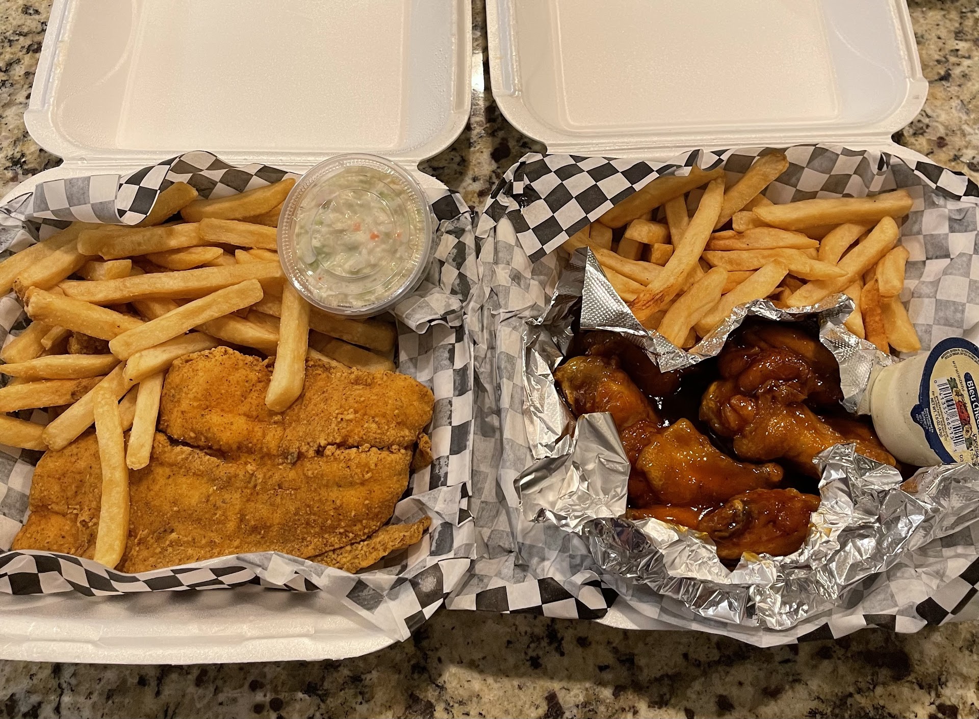 Well well… The food is good here. One of my favorite wings spots besides slices pizza in griffin, ga. I called about catering for my mom’s 70th b-day 4 months out in Oct. 2024. She wanted me to call because she loves their fish is closets to ED’s fish in Nashville, tn. But I was told to call back in 15 - 20mins. Cool give you time to come up with prices for 30 - 40 people. So, I did standing on business. Well I got crickets. Ok, ya’ll busy cause the food good and fish popping out the grease. Call back 30 mins later… ok… yall really busy it’s “lurnch” time… no answer… ok then let me go ahead a place a order a hour later cause moms want some food anyway. Maybe AT&T down again… it’s just ringing with no answer. Naw naw black folks… can’t stand on business again. Why didn’t I have these problems in Tennessee? This spot is not good for catering for any event. They not gonna answer your calls back if you ask. Now I can’t even order from there anymore. Cause they won’t answer my number now. I was just trying to throw so money your way and give you more business…. Damn Gina!!! (In my...