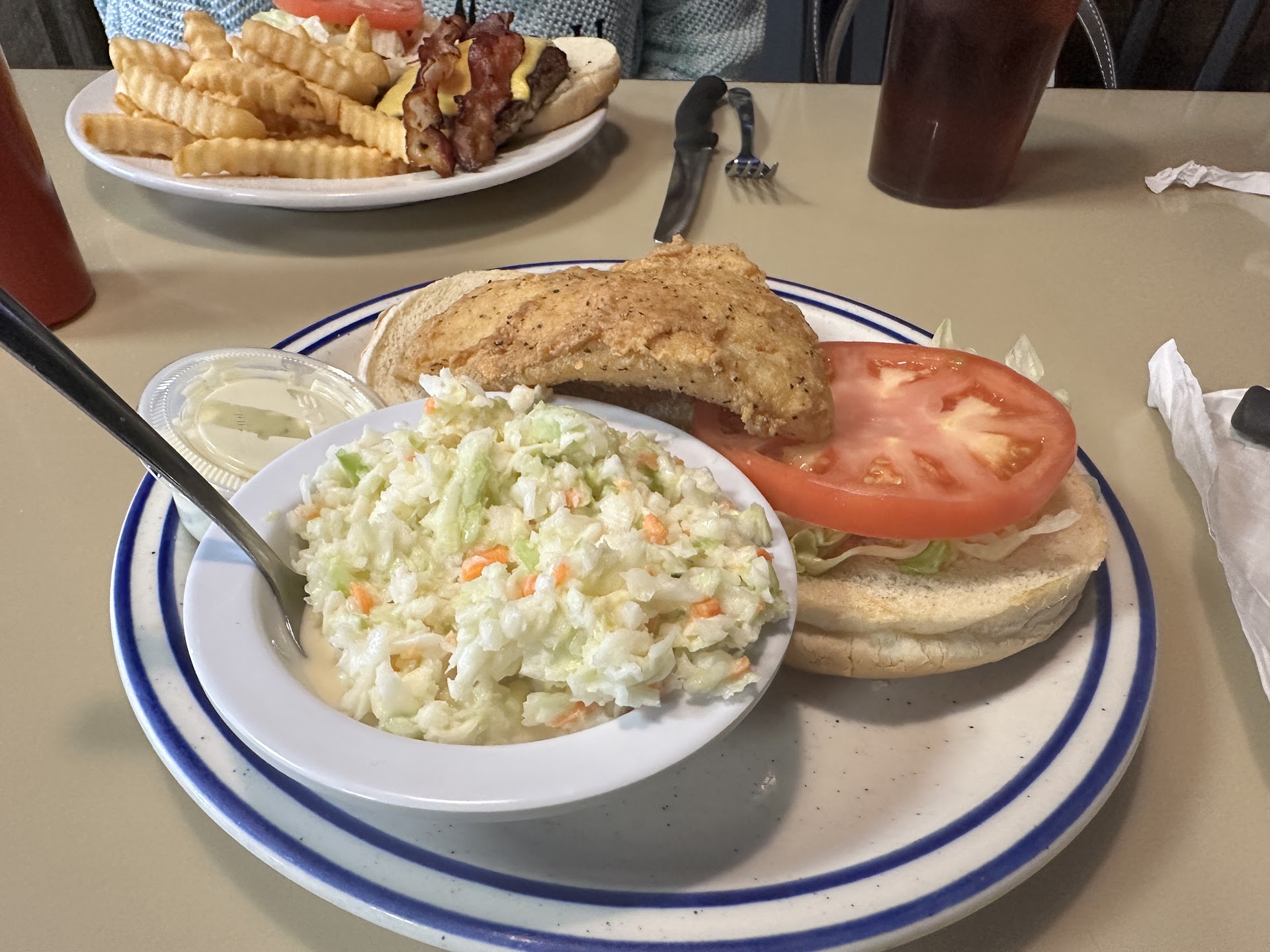 We ordered a bacon cheeseburger with fries, the fish sandwich with coleslaw, and two iced teas. We found the food to be fresh and well made but it appeared to be devoid of any kinds of seasoning. Lack of salt/pepper in the burger resulted in a rather bland meal with very little flavor. The fish appeared (looked) to be seasoned but had very little flavor even though it was perfectly cooked, hot and flaky. The fries were fantastic (after we added salt) and the coleslaw was happily reminiscent of KFC’s coleslaw.