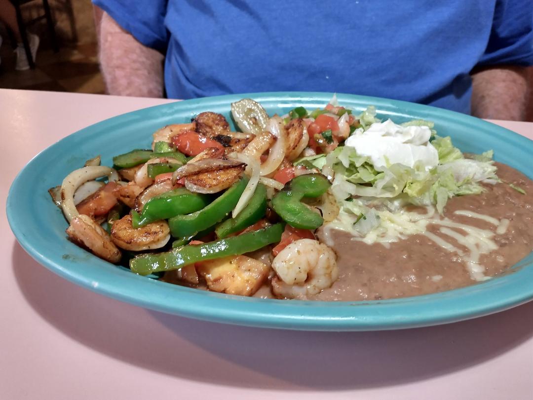 The chips came out first and the salsa was in small carry out containers. The salsa was not the best Iâve ever had, but certainly not the worst either. There was some flavor, but it was not spicy and certainly freshly made. I ordered the make your own combination with one taco and one enchilada, which came with rice and refried beans. My husband ordered the small shrimp fajitas, which also came with rice and beans.