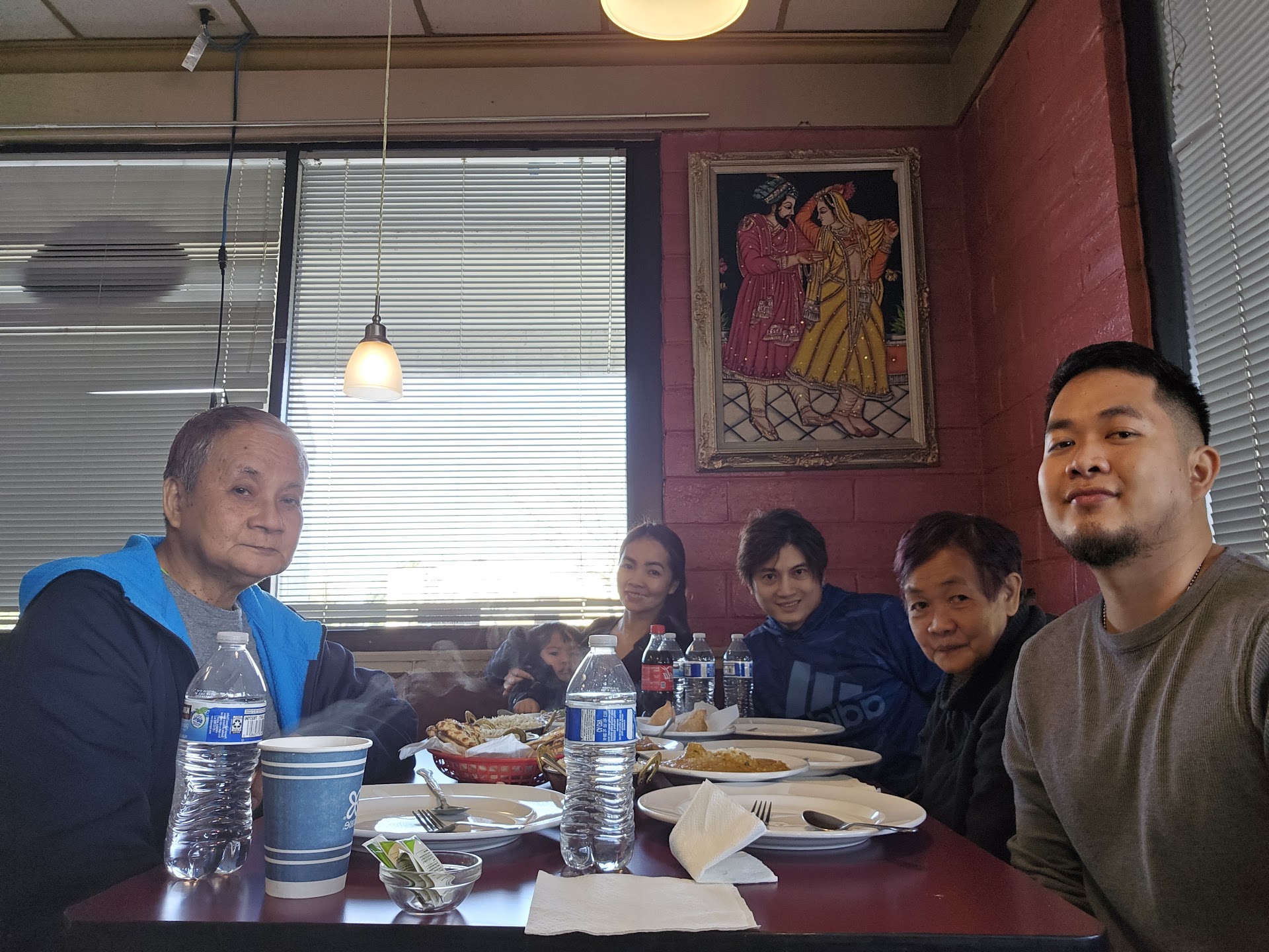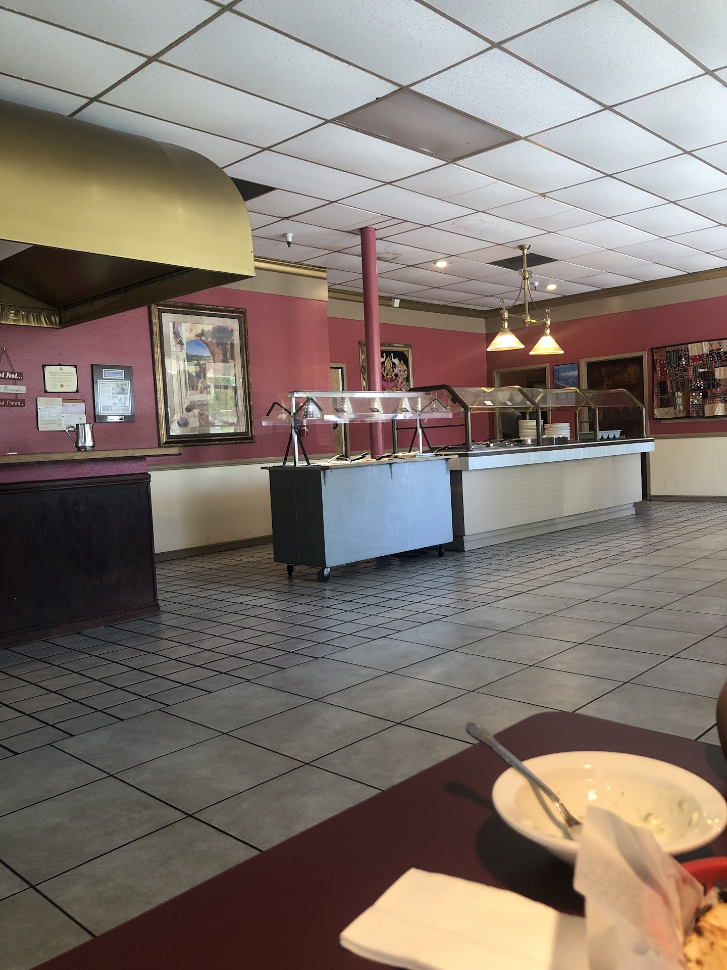 I hate hate hate giving bad feedback, I always try to see the glass as half full. Annnd We LOVE indian food. My first visit here and at about 12:00 we walked right in and sat down. Hardly anyone there, I was happy an yet confused why this place wasn't bustling. But it was a monday so... 😕 Lots of booth seating wide open floor plan where if I wanted I could of done the Macarena and not hit a single person or thing. 👍 A modest buffet set up about three chicken choices (sort of, there were only two pieces of chicken tendori left) and about three curry vegetarian choices, in addition to salad, basmati, chips?, fried broccoli, yogurt, three dessert choices (sort of they ran out of rice pudding) they did not restock and the guy was checking on the buffet but didn't apologize for not having enough chicken or rice pudding. He said something like, "wow the rice pudding was popular" as I scraped the sides of the container getting a meger amount even for a mouse! That said, this place was dirty, bathrooms dingy and there was bar soap in the bathroom (eww! I don't even like using bar soap after family members😱), booths were sticky with some sort of black goop on the top back rest of the booth. I know because I put my arm on it and then had to peel my arm off. Found a black short straight hair in the buffet raita! Rice seemed extra greasy.The naan basket was woven and wooden, and was dirty (black) right at the edge where you pick it up and carry it (eww!). The "clean" plates had greasy finger smudges on all the edges.They didn't restock empty food for buffet rice pudding and tendori chicken... (Which I can't believe we stayed and ate! I guess I was hoping it would not be so bad.) The guy was nice though... But sooooo disappointed. 😖 I'm giving two stars because i didnt die or get sick...