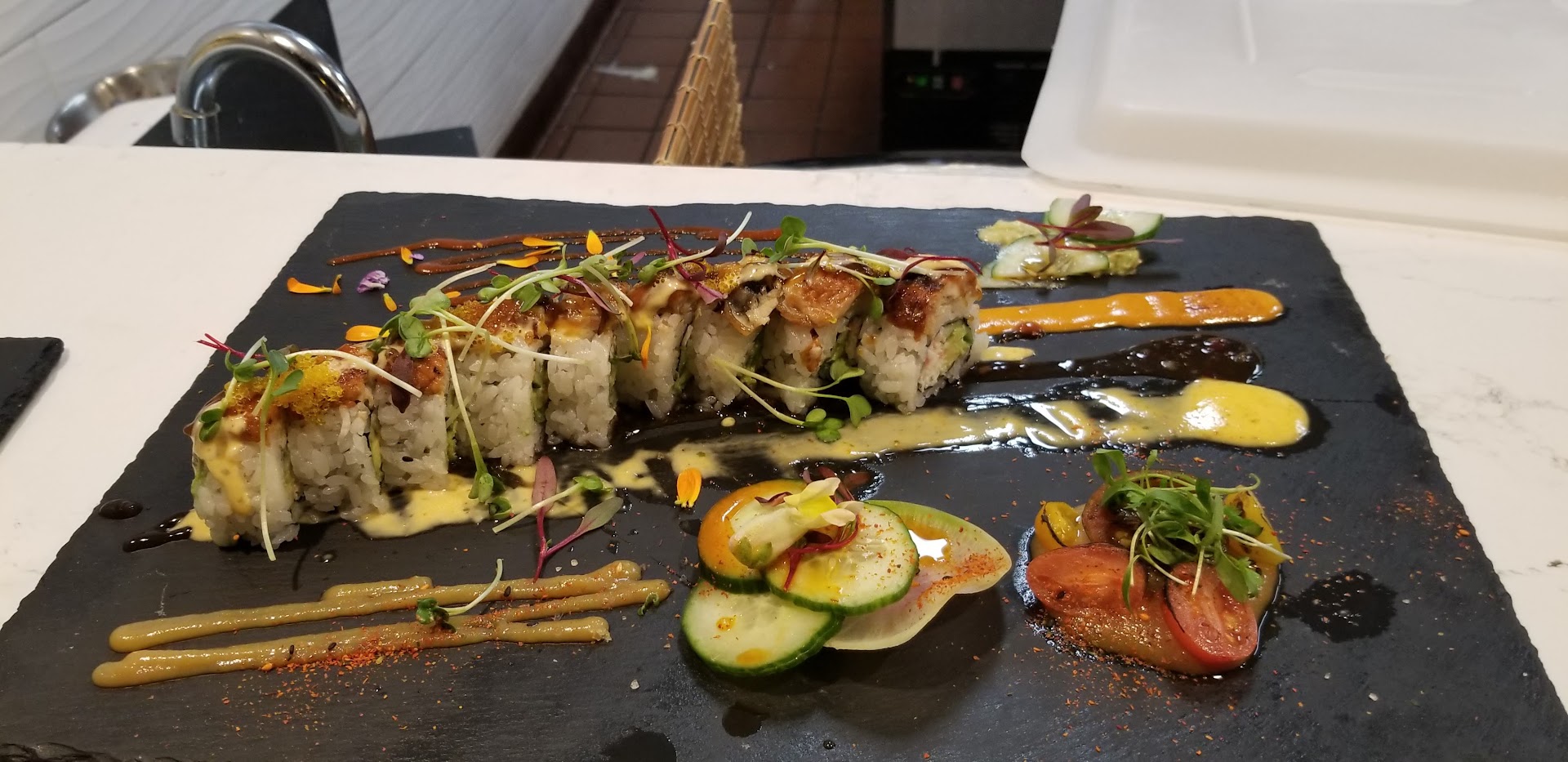 Read moreUpon entering, my male friend and I were warmly greeted by two to three Sushi/ Sashimi restaurant staff. He and I chose the bar to sit as I only craved a couple hand rolls or nigiri fish to eat. The friend of mine has had an exceptionally difficult last few weeks with today he most likely became dehydrated from exercise in the heat outdoors and excessive running in the sun. A male server brought waters after I began scanning the QR code menu and smiling, browsing the food options. There was no problem there as I did not have to wait long for a refreshment or to simply be welcomed.
