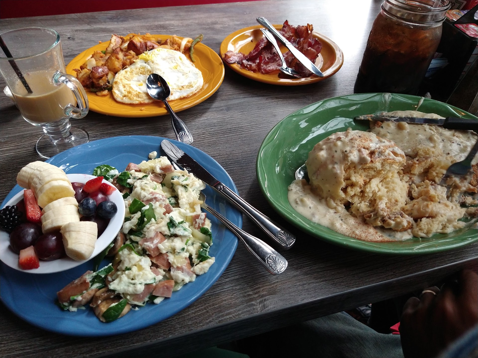 Ā Ā Ā Read moreToday was a gorgeous day and wonderful atmosphere to sit outside. The music may turn some off, with loud techno covers, but I didnāt mind it. I would not recommend sitting inside, it is a very dark and a bit drab. I ordered the traditional eggs benedict, and it arrived in about 10 minutes. I requested that my potatoes be crispy, even describing āburnt" as being ok. When my breakfast arrived, I seen that my potatoes looked the same as other patrons. I told the waitress that I was hoping for crispy. She kindly said, āIāll take it back and fix it.ā She left and I cut into my benedict, finding that it was cooked all the way through. I waited for the waitress to return. She came back with my potatoes, they were cooked in the same exact way as before. I informed her of the eggs being overdone and she took my plate to fix the eggs, along with the utensils. The hollandaise sauce was almost separated and not good. The Canadian bacon was very thick and more like a ham steak. I waited for quite a while for her to return to the area and asked for more silverware, to at least be able to eat my potatoes. After about 15 ā 20 minutes, the rest of my order returned. The eggs were again over cooked to the point of basically being hard boiled. I ate and left a 20% tip very unsatisfied. I would not recommend this location if youāre looking for quality breakfast food. The service was adequate. The atmosphere was nice outside, if...