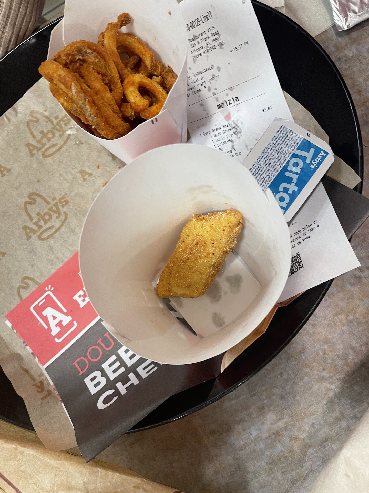 We pulled away down the street onto the highway as I was grabbing a couple napkins to clean up the cup so I wouldn't have soda all over my hands and the cup holder. After we got back onto the highway towards home I finally was able to look into the bag and start eating my food on the ride home. Boy, we were in for a surprise. They were nice enough to give us a handful of napkins, a whopping two sheets of coupons plus a paper stating they're hiring or something, but uh. The only thing that was in the bag was the Greek Gyro and a single Beef n Cheddar, and some sauces. That's it. It was too late to go back, there would've been no real way to prove that we were missing food at that point, and we were already pretty far from Altoona, so there was no turning back at this point.