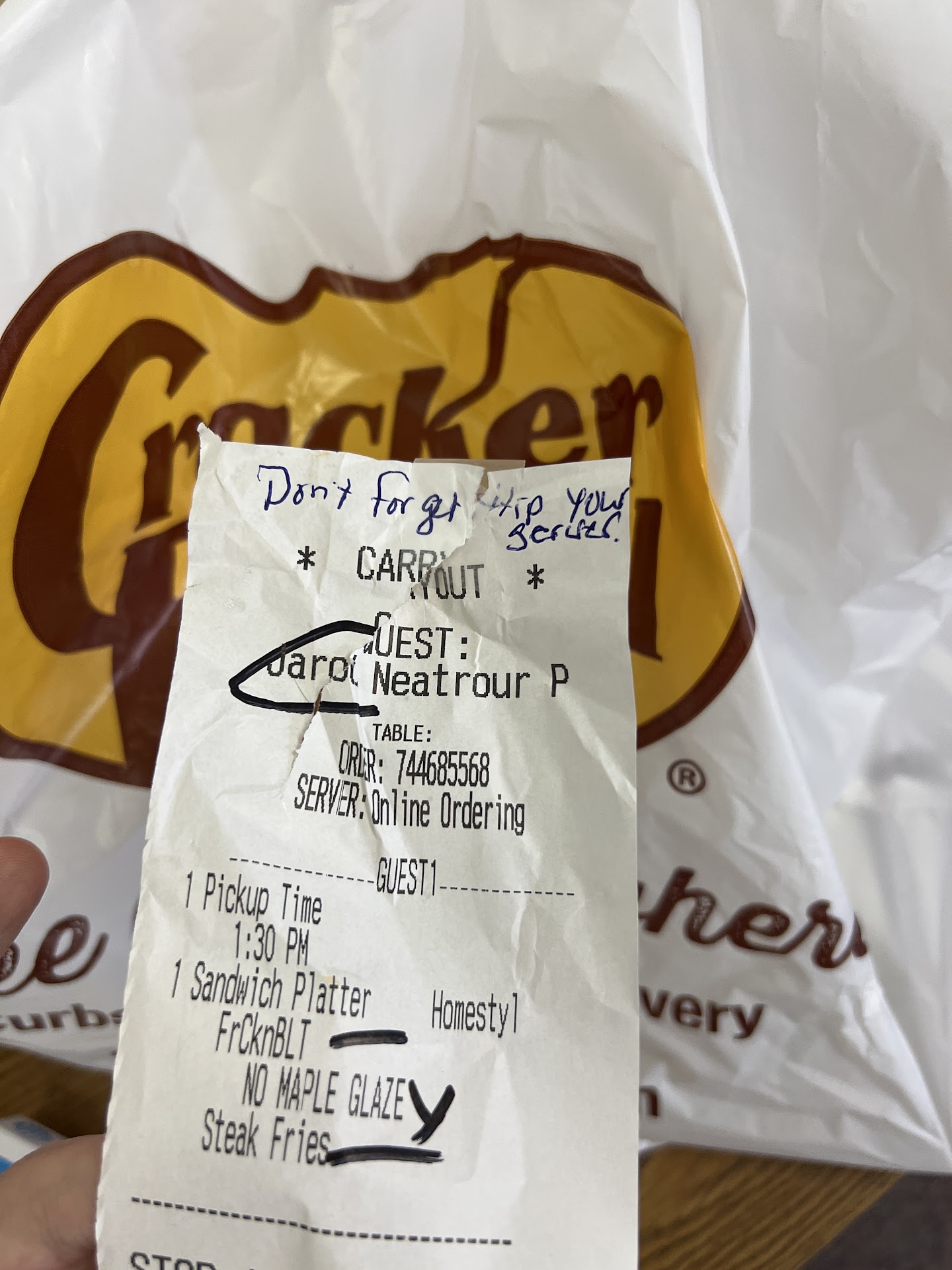 Read moreI try not to be negative about hosts/hostesses at restaurant's especially if they are "handicapable", however the young man at our recent visit was a bit rude. He got a touch of attitude because when he asked how many in our party we responded with "3" he looked around and said (with some salt in his tone) "I can't seat you unless the whole party is present. One person in our party just happened to need the restroom and I wanted to get my 83 year old mom to a chair. Needless to say we stood there while several patrons (which I'm assuming were regulars) just waltzed right in and sat where they pleased! If this is the policy of this business, it is in my opinion not a customer friendly one. This policy should be reviewed and a better one put in place for the older people coming in to dine. I'm going to add to my first review. We thought we'd give Cracker Barrel another shot on 4/20/25, (which of course happened to be Easter Sunday) we made sure to call the previous day to ask about their Easter Dinner special. At that time the lady on the phone seemed a bit confused as to just what came with the dinner and unfortunately did not inform us that if we were coming for that specific dinner to come early because it wouldn't be served all day. (Due to the fact they'll most likely run out of EVERYTHING! 🤔) had we been privy to that information we'd have either come earlier or not at all, but I guess they're in the mind set that if patron's come in for that special then (oh well, who cares if we can't accommodate them) they'll stay and eat anyhow, so we're still making that oh mighty dollar for our pockets! Kudos to this establishment (insert sarcasm here). Well much to our disdain we did unfortunately stay and order something different from the menu, I mean at that point what else do you do. And for those if you thinking "get up and leave, you have that choice" hind sight as they say. So, this is what we opted for, room temp. paste that was trying to disguise itself as mashed potatoes with what I'm certain was topped with a carefully measured 1/4 TSP. gravy and the meatloaf that was encrusted with a protective armour of char. (Was not edible) I could go on, but I'll just end with this. Not worth the money we spent for this experience. Thanks for an unforgettable