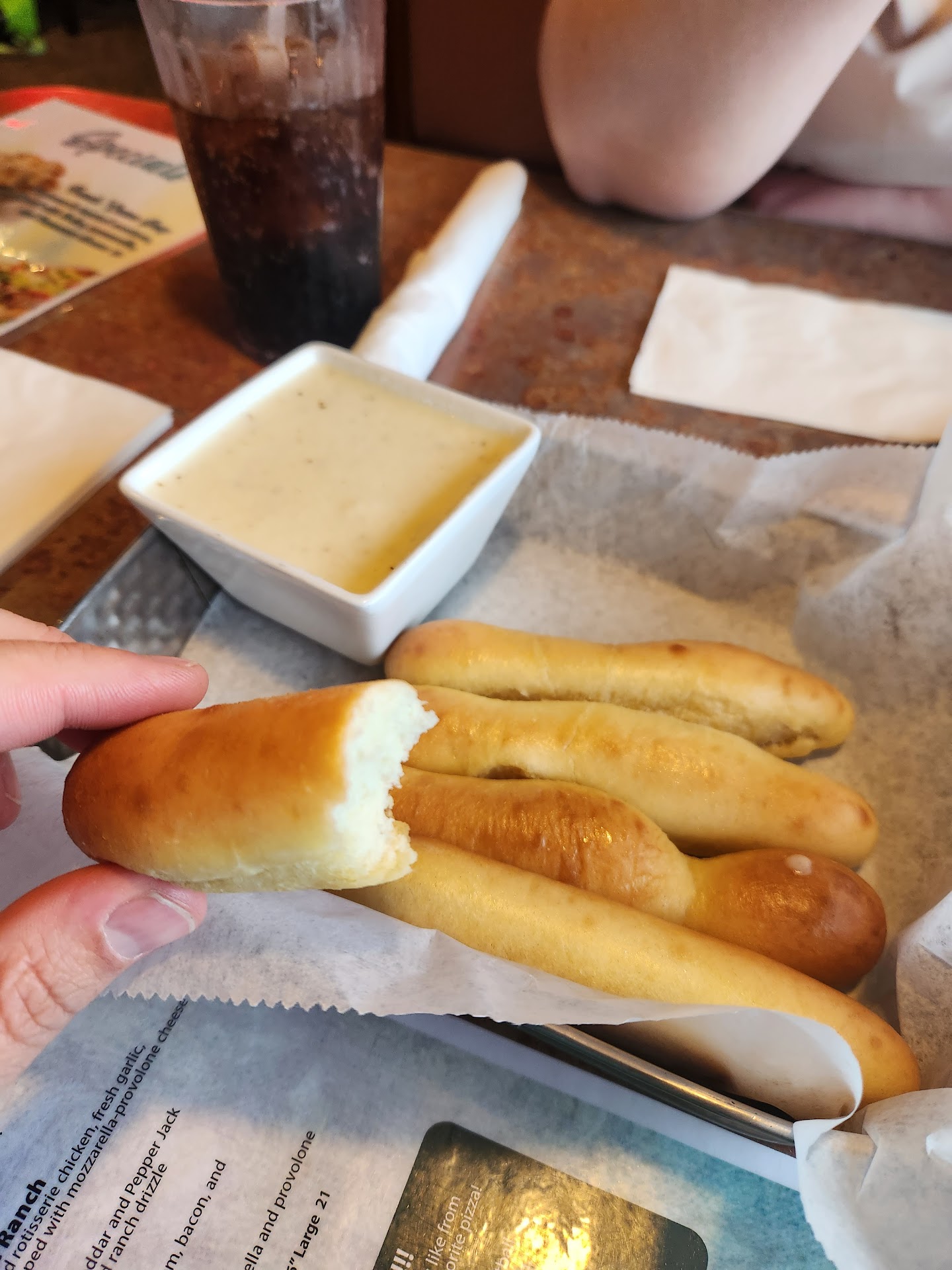 Read moreOverall, the experience was good. The server was pleasant and professional. Made sure my family and I were always good or if we needed anything. Started off with bread sticks. Then we ordered pizza. Loved the sauce. Not to sweet , but just enough to be pleasant in taste and consistency. Had the chicken wing special that was $.65 and the wings were really good. Little on the spicy side for the kiddos, but over all really enjoyed them. Texture was good, crunchy, not burnt. Came with ranch, or blue cheese, with some celery sticks.