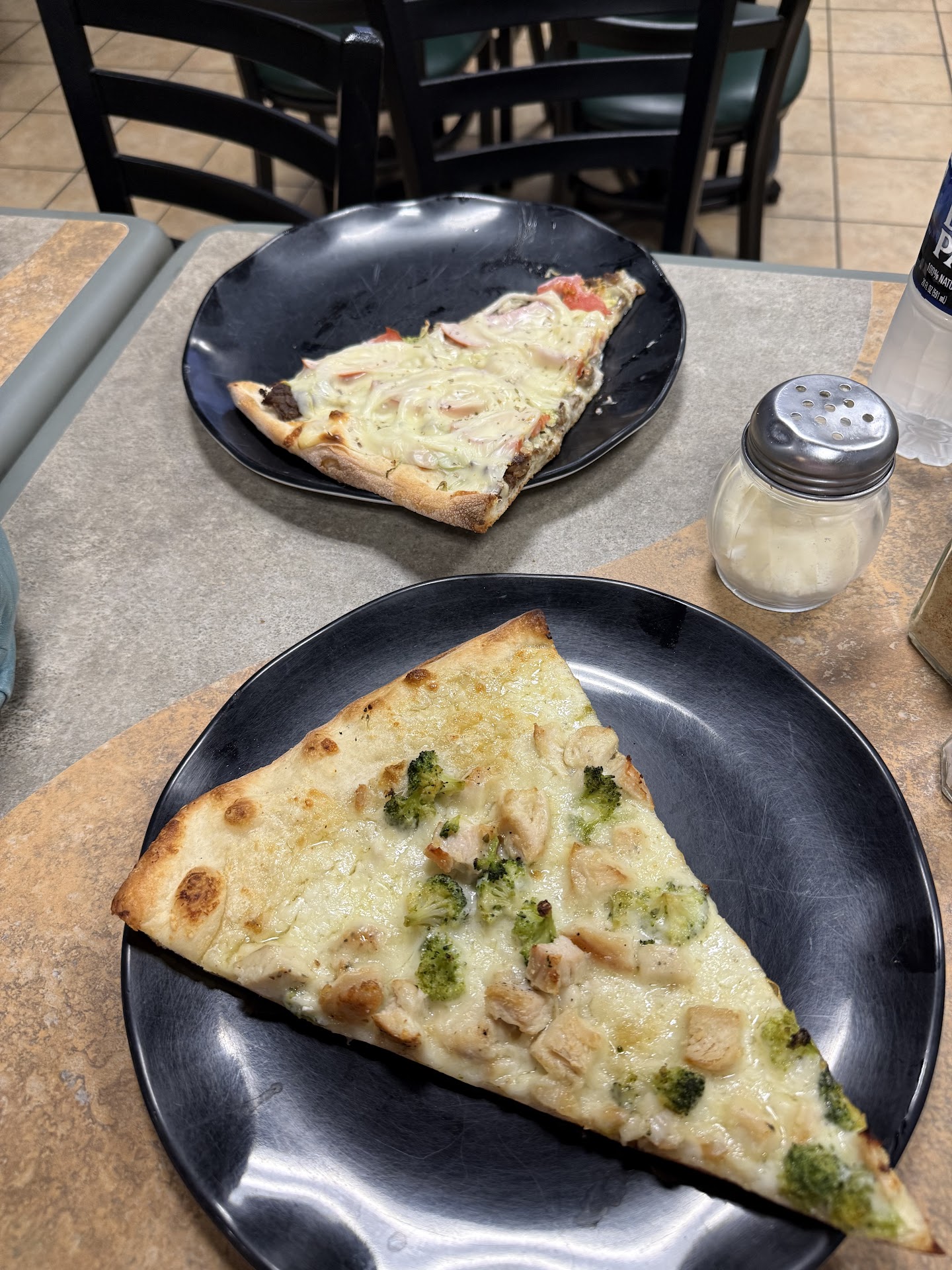 Read moreThis review is solely based on pizza as it is the only thing we ordered. Mine was the chicken and broccoli alfredo. It was excellent. My husband had a cheese steak pizza and he said it was only okay but feels the issue was that lettuce wilts in heat, so they use too much cheese to create a buffer. With less cheese and no lettuce he would have liked it better. He'd try a different slice but certainly still go back. Mine was excellent, so I'd still give it an A+ for pizza and I'd certainly come back again. Is it particularly fancy? No. Lighting could be better. But I'm just here for a quick slice so it doesn't matter very much. The young employees were very...