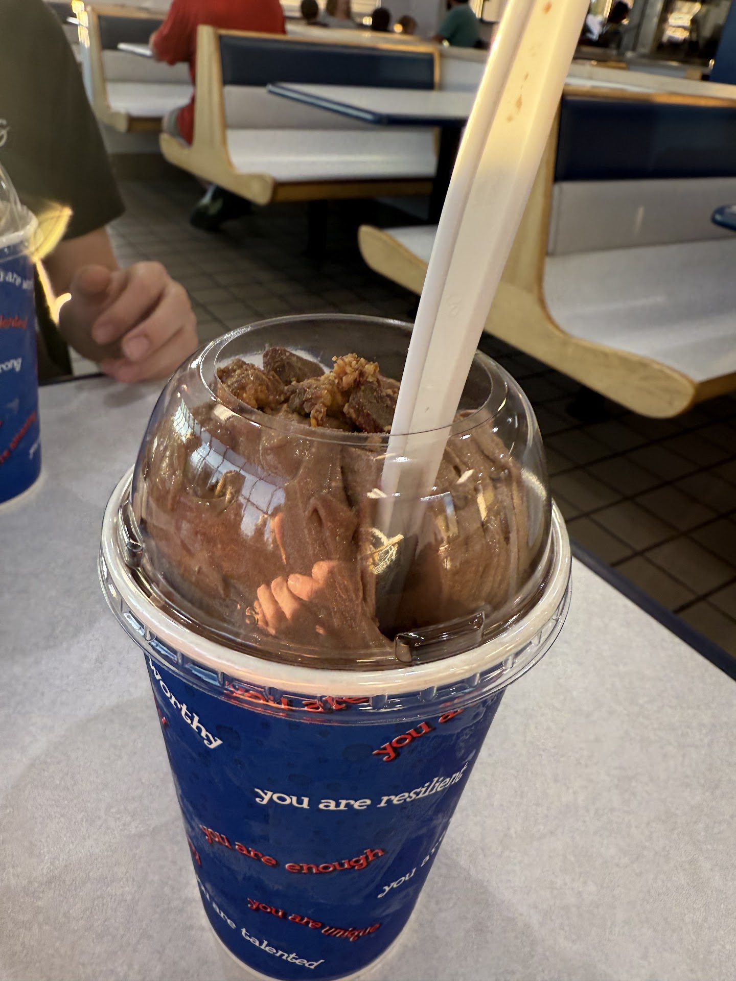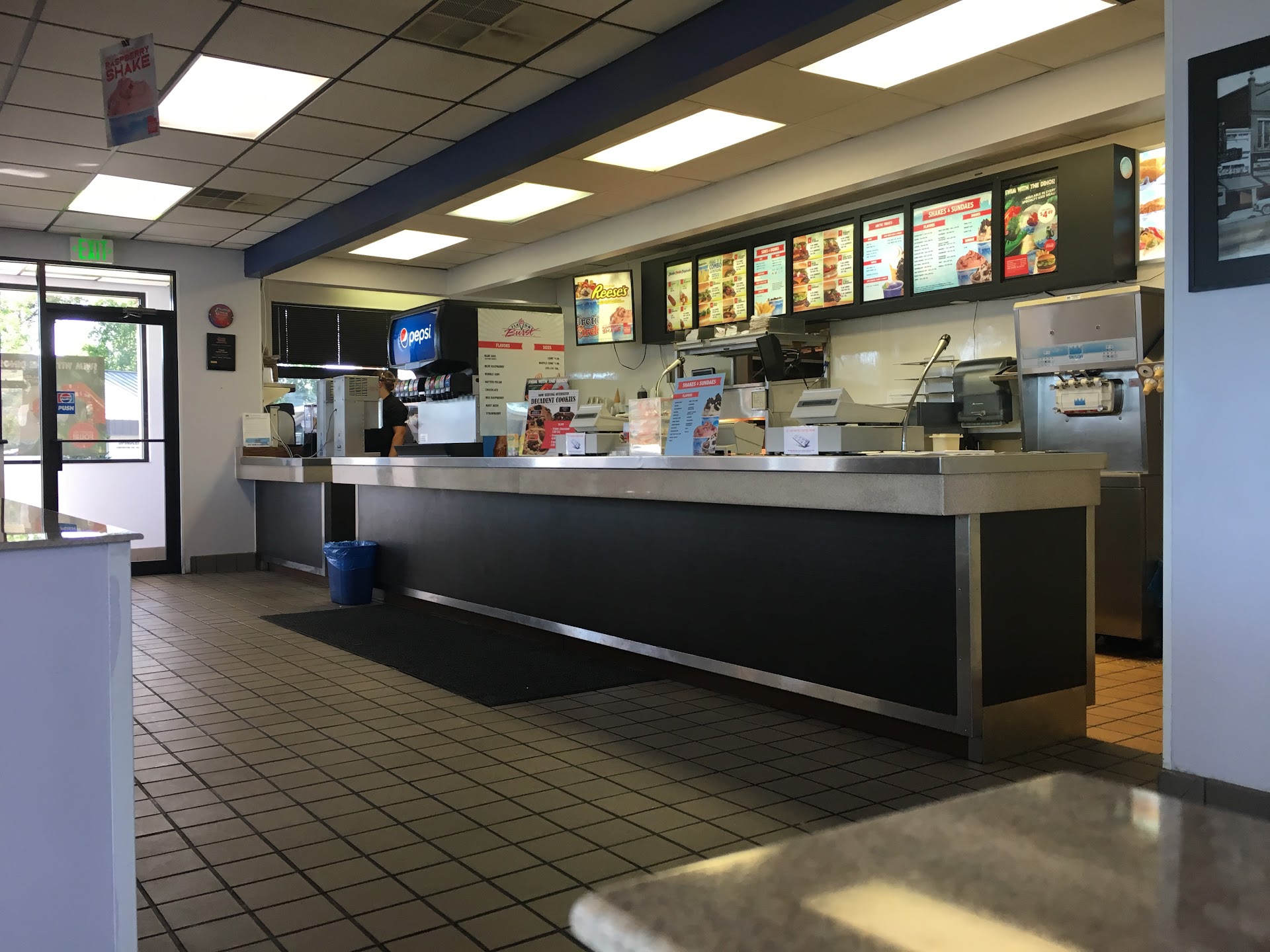 Came here when there were 3 cars in the drive through, and one other customer inside so no excuse of a rush can be used. I ordered 2 medium shakes, and 2 cheeseburgers. Because we were kinda in a rush and just wanted to stop for some quick food. Pretty simple right? Apparently not. We waited over 17 min for our food, once we finally got it, both of the burgers had a single pickle, no lettuce, and only mustard....I ordered a fudge shake with some cookie dough. Got a half swirled vanilla chocolate "shake" with fudge stuck to the side, reeces peanut butter cup peices, cashews, and brownies, possibly the furthest from what I ordered, and my girlfriends Moose tracks was filled maybe halfway...each "shake" was $6, thats was ridiculous overpriced for what we got. On top of all this we waited for about 5 min for them to even take our order...very very unprofessional with people inside not even knowing how to do their job. One girl was basically running it all while everyone else was headless chickens that had to be told what to do. I am a very patient person, but this was ridiculous, if you're looking for quick food go...