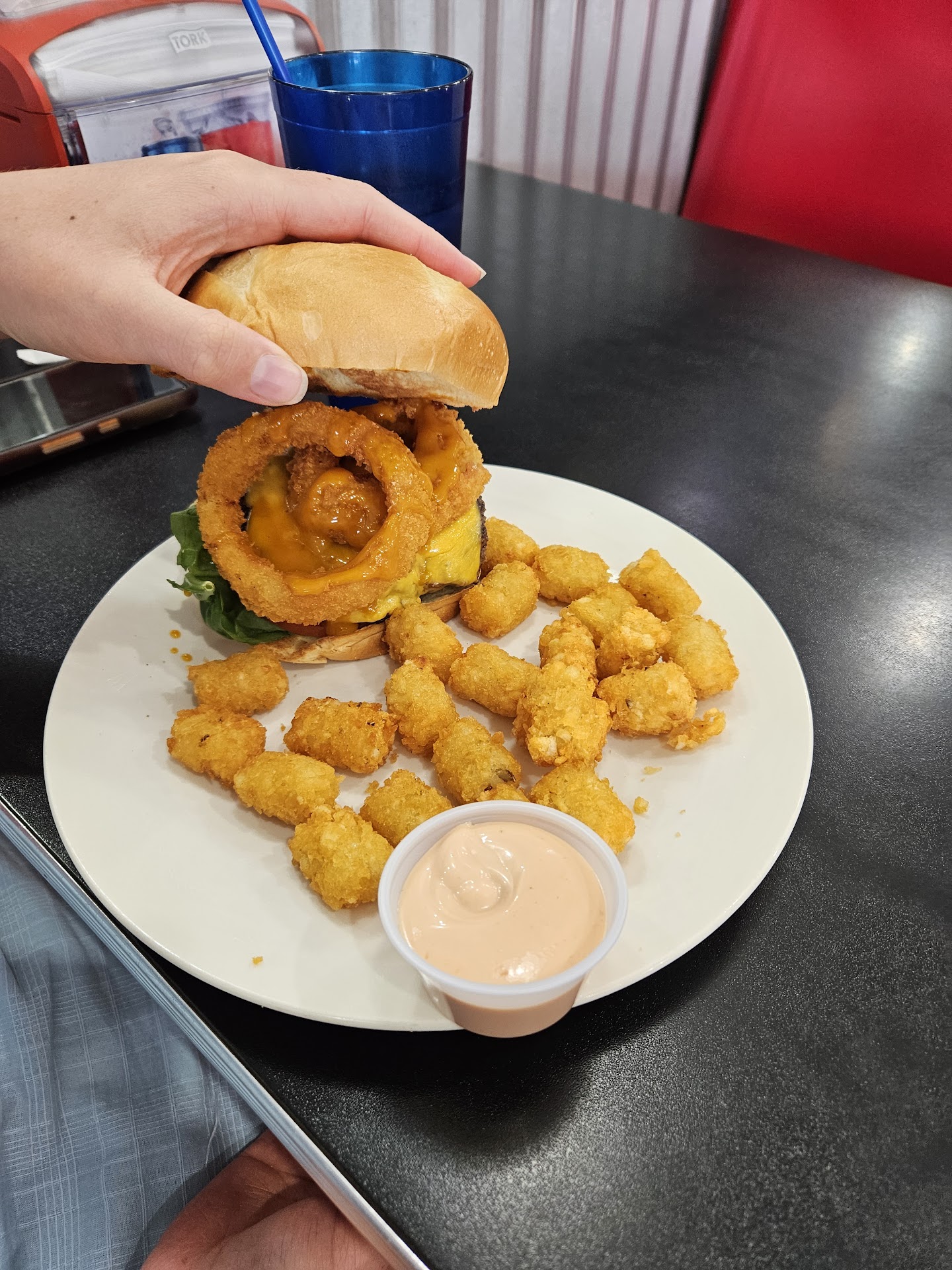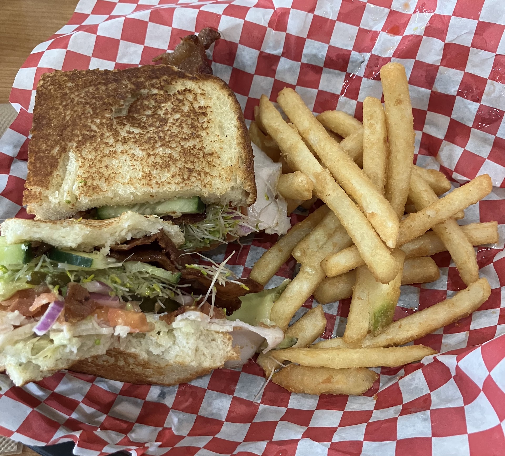 Read moreI normally LOVE this place but today was a bad experience. I called in an order before the lunch hour and requested to pick it up in 25 mins. They took my payment over the phone, asked for a tip, gave them a small one but was hoping they would get my order on time because you don’t really need to give them one before you order or even for a pick up (they do not have servers here, so tips are unnecessary). Anyways, I came in early at like 11:48 ish, waited for a bit to tell them I’m here, they didn’t even start on it and had me wait around 15 mins to pick it up. I was pretty annoyed about the wait, but when I got home and ate my burger, the patty was half the size it is usually and didn’t taste like it usually does. It’s so upsetting because I love their sweet potato fries & their piña colada burger, but something was way off. I called and told them and they said they had new cooks, but given that I had called way ahead of time when they weren’t busy, they had time to train them to get the burger correctly made and ready when I came. I was just bugged that they promised to have it ready at 11:50, and then didn’t, even though they KNOW they have a rush lunch hr AND trainees. Could’ve been handled better. So make sure you don’t order ahead for pickup because the food will be half-a$$ed & late. Order in-house and have a seat. Guess I should’ve gone to CupBop. PS: Tips are pointless when ordering over the phone. It does nothing to quality of...