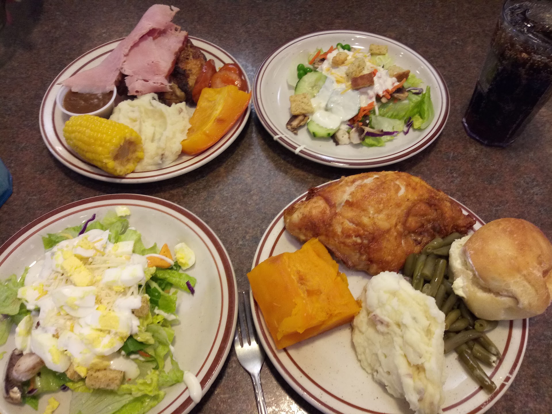 Read moreI've lived in Utah for years and heard about this place from ads. Thought it was sort of a cheesy All-you-can-eat place. And imagine that: it is! First impression was the really annoying country music playing in the background. Then the busboy kept singing, badly, and loudly. I don't mean just occasionally, but all the time, and even when there was no other voice in the music track. It's rude to whistle, hum, or sing in public unless it's part of an act! He talked to himself too, and forgot about customers waiting for service. Then the food. OK salad bar - well it's pretty good. But they did not have olives, chopped the radishes up to a mince, and most of the prepared salads were not at all appetizing, but I don't believe pasta is supposed to be in a salad. The soup was barely warm, a health violation. It did not taste homemade. Then the entrées, the only thing that even appealed to me was the fried chicken (there were many other options). It was pretty good, even though the breading was sort of falling off. The mashed potatoes had the peels in - which is another pet peeve for me - if I wanted mashed potatoes with wet cardboard, I'd order that. Peelings don't belong in mashed potatoes! I like the peels on boiled potatoes, or baked, or in some other circumstances, but the whole point of mashed is not to have peels in them. The vegetable selection consisted of all the vegetables I don't really like, and looked sort of sad in there steam table containers. Desserts looked OK, but I did not really partake. I like other All-you-can eat places, but won't go back...
