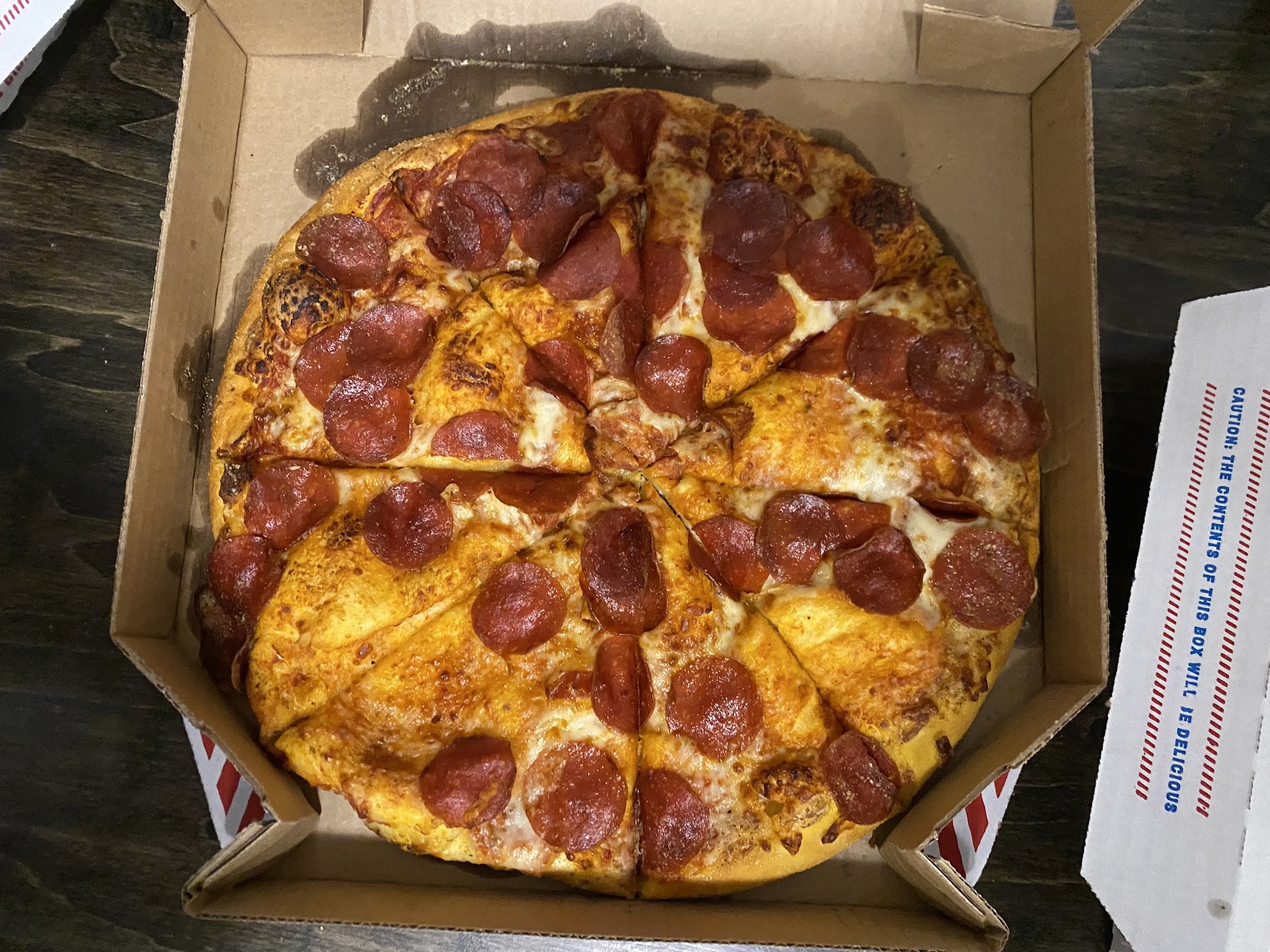 I noticed that the Pizza tasted really sweet, like it had sugar in it. It had only two toppings, pepperoni and green pepper. The green pepper was cut very tiny, and so thin it was see-through, which I know is a cost-cutting measure due to the rising cost of things. Again, this pizza did not taste like I remember Dominoâs used to taste. I basically ate off the pepperoni and threw away the rest.