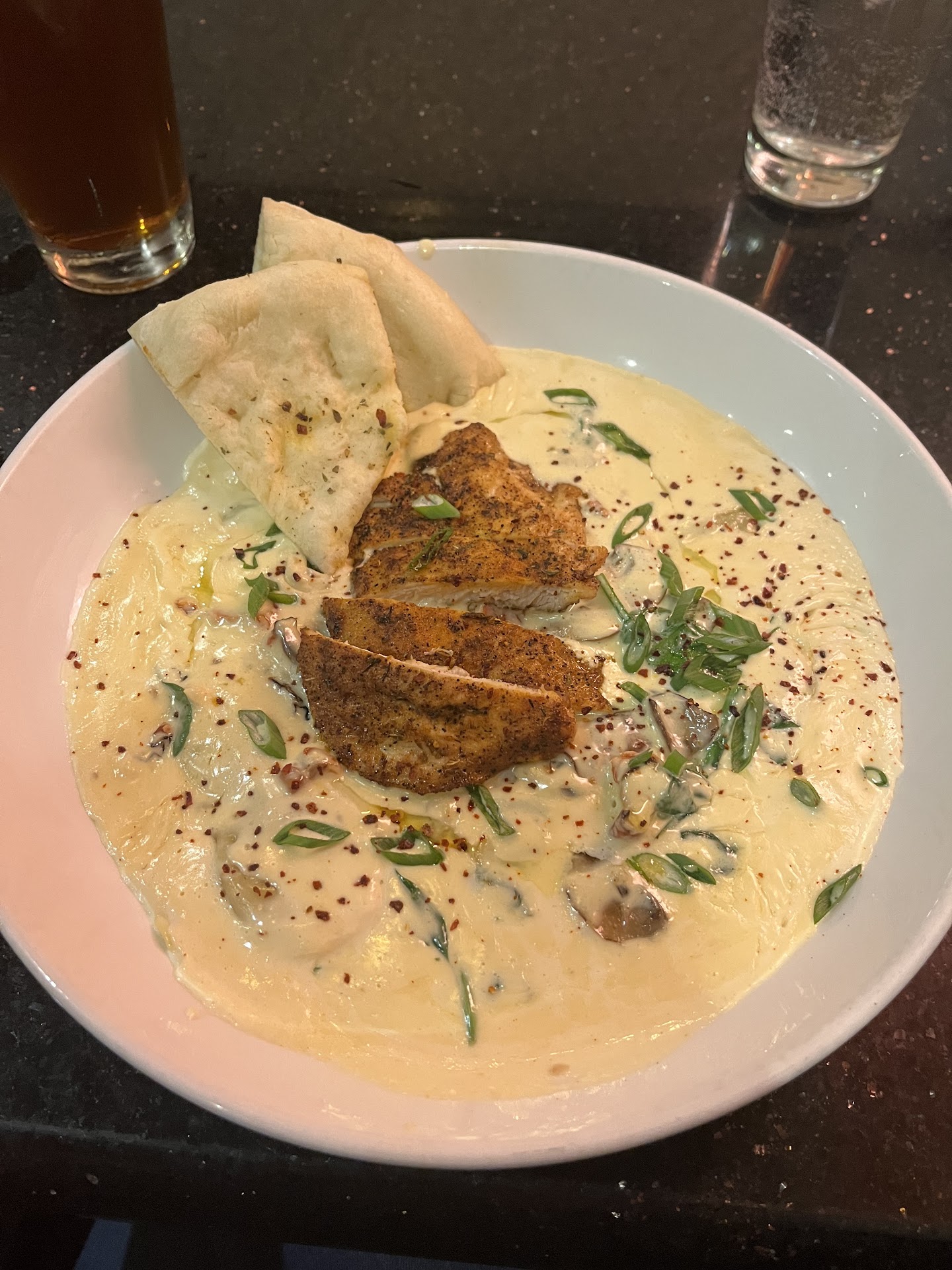 Cons: Unfortunately, in our opinion, the flavor combinations were a little strange -my husband had the Alfredo, the pasta was cooked very well and the alfredo sauce was good, but there was a weird very stiff cream on top, almost the consistency of poached egg whites, but it wasn't flavorful and it was stone cold. I am not sure if it was supposed to be cold or what it was at all. My husband scraped it off and then enjoyed the pasta. Such a shame to pay for that to have to scrape it off and alter it to make it enjoyable. -I had the stuffed chicken breast and it was excellently breaded, but it took a couple of bites to get to the actual stuffing and when I did, I got slammed with a strong flavor of goat cheese and prosciutto, weird combination. I understand that some people really enjoy goat cheese, but I don't care for it and the menu doesn't list it containing goat cheese, just herbed cream cheese and dijon cream, but it was a very strong taste. Possibly the mixture of herbs in the cream cheese mixed with the flavors of the dijon cream to have a similar flavor to goat cheese. In any case, I am sure that a goat flavor can go well in a food when planned well, but this combination was weird to my taste buds and didn't go with the chicken and prosciutto. Again, the chicken and breading were cooked perfectly but then the stuffing flavors kicked in and my taste buds really didn't like it.
