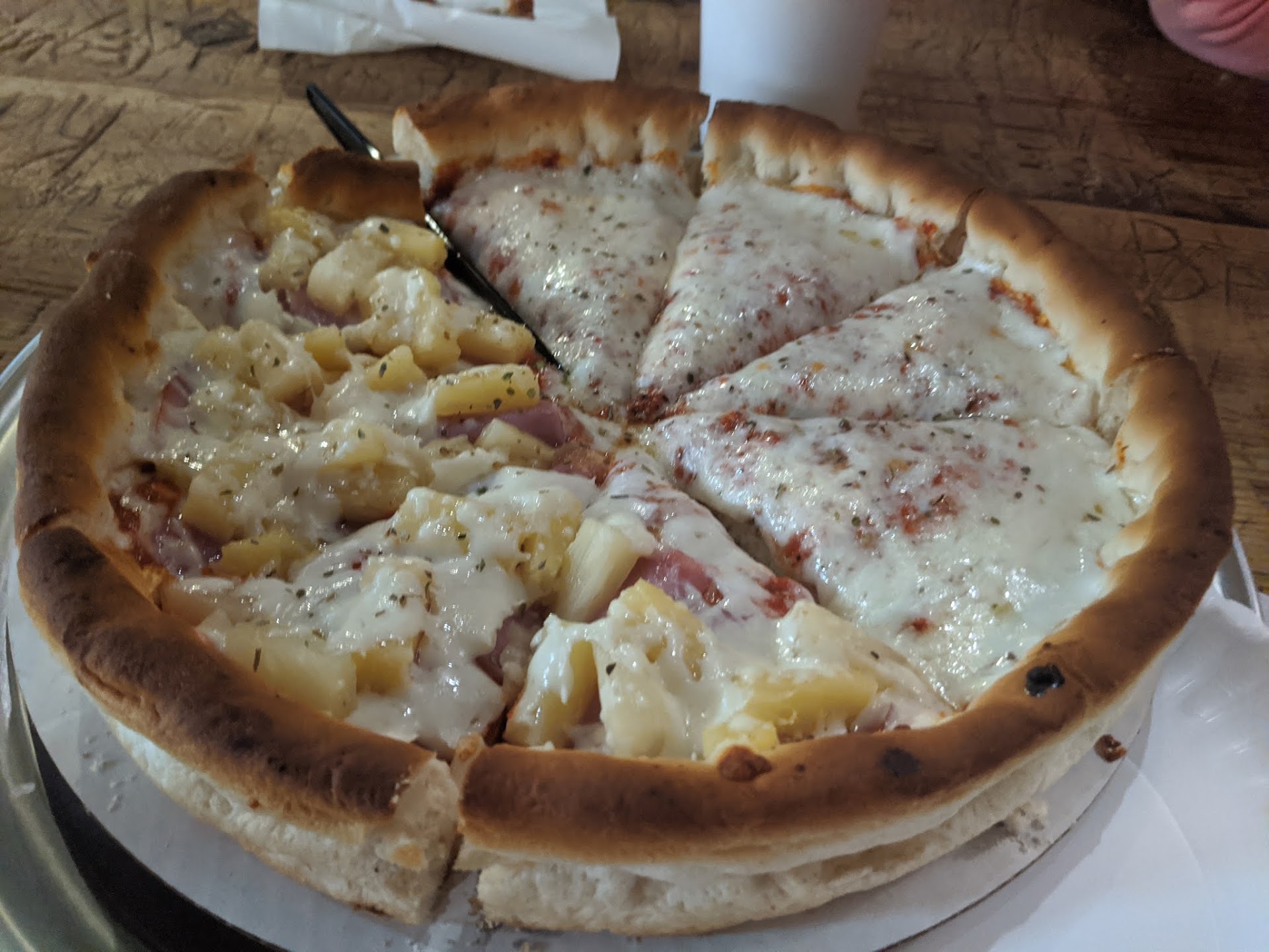 Read moreOverpriced and not that good. I will not go back. The large pizza is about the same size as a Little Caesar's pizza and runs about $17 currently for a 2 topping. (Papa Johns, Papa Murphy's and others are bigger pizzas and better tasting and less money). I asked for alfredo sauce, rather than red, and they charged me $2 extra. The crust is like a regular bread crust rather than a traditional pizza crust. We had 6 people in the group and not one would eat the crust part (a first in my family) where normally that is a favorite. We had one person in the group that had a coupon from Happenings Book for 50% off a pizza. For that person they raised the price on the 3 topping pizza from $17.99 to $26 claiming the chicken was extra and so was the afredo sauce and charged $13 for a 1/2 priced pizza that should have been $9. So if you are using a coupon beware they are dishonest and arbitrarily change prices. Take my advice and just go somewhere else. You'll save money and have a better pizza. (The good part of this place is that the alfredo sauce was good and the crust...