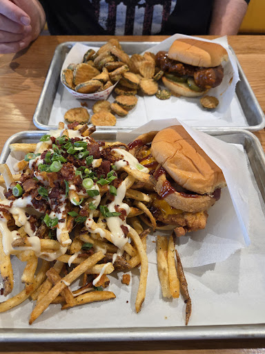 BBQ chicken with onion rings, I do not remember the name of it. My husband ordered the Nashville. We also got the fried pickles and the loaded rosemary and pepper fries. It was extremely good! Customer service was terrific. The only reason I gave it a four, was because I wanted to use their wifi and no one had a password for us. It wouldn't be a big deal normally, but after a long day out on the back roads, I used all my data and wanted to send someone a photo. I was excited. Lol, I know, 1st world problems. Service was really great, though. Atmosphere very pleasant. All of it, enough that I briefly thought; "Should I open one of these?"
