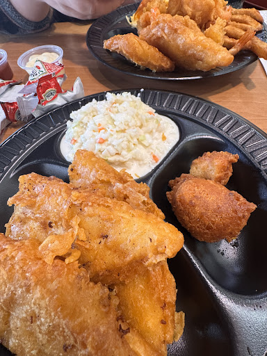 We used to eat here often, however my husband started getting sick every time we would eat here! I didn't think much of it, because my daughter and I weren't getting sick at all. Now more and more, we all end up sick and we have found if we eat the tartar sauce with the fish, we end up regretting it!? I'm not sure if they are keeping it for entirely too long. Or what is going in just beware of the tarter sauce! The location is not a great location, it is HARD getting out of this parking lot! They often want you to pull forward, to allow tge food be ran out and I don't blame them at all for this, bc like many teens, I too used to work there, and the annoying ding, ding ding of the drive up window bell would drive me crazy! That being said, it suuuucks trying to squeeze in the tiny space alotted past the drive through and there are often several vehicle all trying to pull up there, it's already impossible to get out on busy market street, and them contesting the one way exit with more than 2 vehicles, leaves people cramed in. Especially if someone (its me, I'm someone) is trying to turn left out of the restaurant. Turning left is crossing the lane, to get to the far side of the street, again, impossible with the constant flow of traffic! Ok enough about the parking space rant- the food quality, is usually pretty good honestly, I know, I know, don't come for me bc I mentioned getting sick earlier 😆 , I really want to belive it's just the tarter sauce man, bc I do love the fish, clams and hush puppies! 🤐 Mostly kids working here which is usually a bad thing (bc let's face it, we all think our teens are little angels) news flash, most aren't! 😉 (including mine) but I will say, the ones here have never been rude, or disrespectful that I've seen, to customers. Using manners. Try to get you in and out quickly, they actually seem to care about people's experience here. All in all, it's not a bad place. 3 stars bc price and parking leave something to be desired! Uploading pics and maybe video next time I...