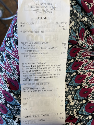 Read moreOk, so I've been loving. Firehouse Subs a long time. I'm from Jacksonville; they're from Jacksonville. So I was excited to see them open in Loganville. Went in lalll lst night with a friend. We ordered sandwiches to go, which were delicious. However, we also ordered two cups of chili, only because I've had their chili & it was delicious. But, last night the chili we were given was probably the worst chili I've ever tasted. And, it tasted burnt, which, sadly, may have been the best tasting thing about it. Please note that I gave this review 3 stars ONLY because the sandwiches were fantastic; had I only been rating the chili, it would have been 0 or 1 star, whatever is the least possible. One more thing, Firehouse is a little on the expensive side for fast food, but normally is totally worth it, (our sandwiches were $13.25 total for both. I can live with that, but paying $8.33 for two small cups of chili, which went in the garbage was absolutely ridiculous, and will NOT...
