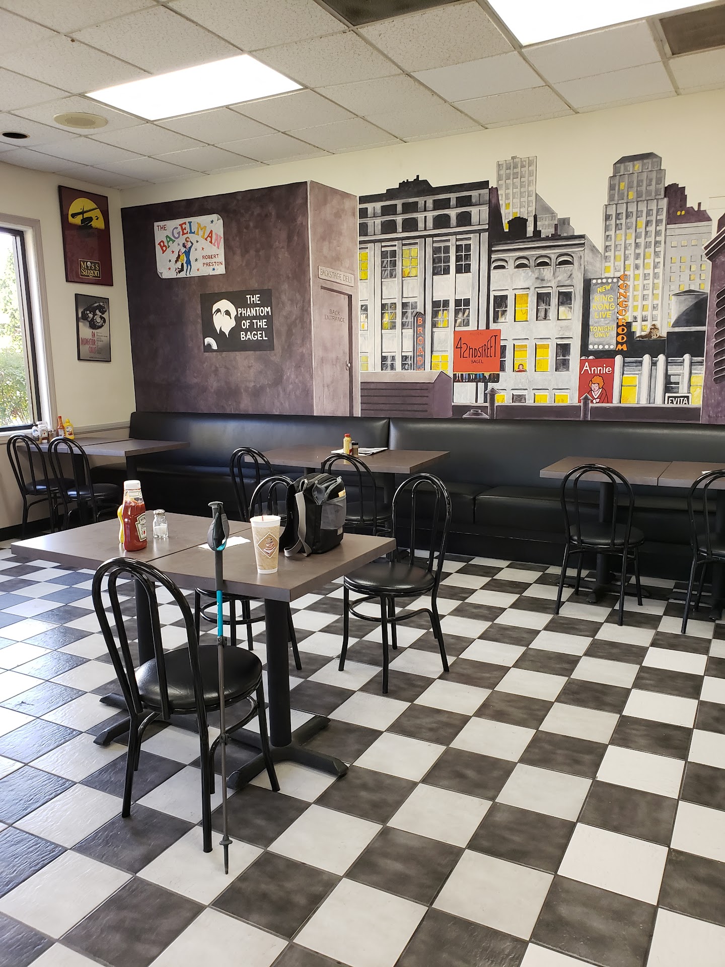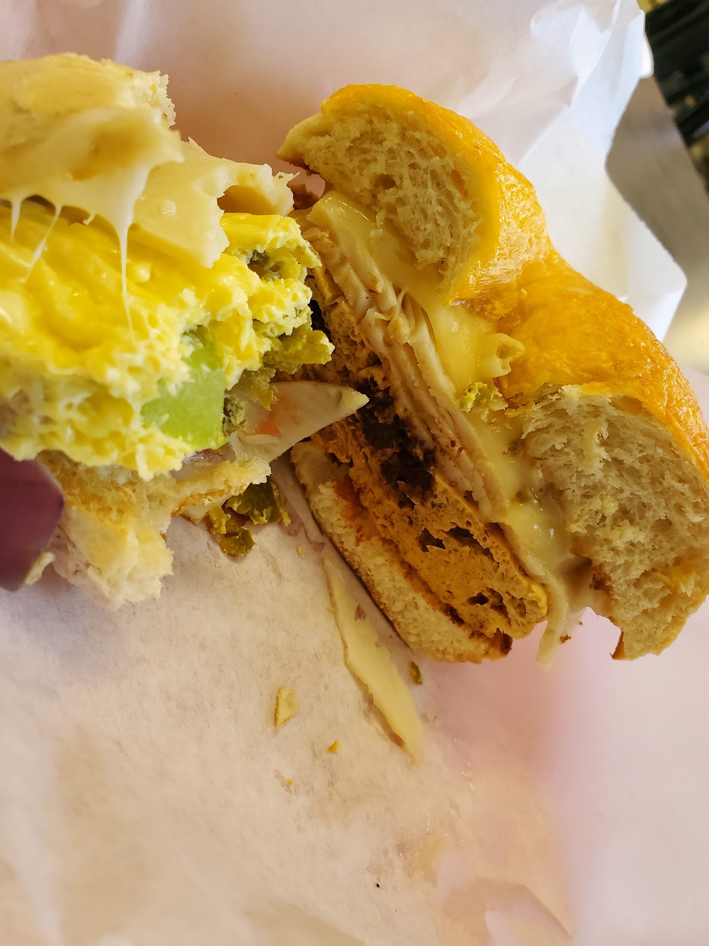 Read more1st Timer! As noted by the picture more than half of my Ranchero on a sourdough bagel and the other half, Chipotle on a cheddar bagel (traded half with my other half). I'd actually rate it a 10/10. The variety of bagels to choose from, as well as the cream cheese spreads they have available is second to none. Besides the variety of bagels and spreads, being given the option of Ham or Turkey as well as cheese (Provolone, Swiss, Cheddar, Pepperjack, a little unsure but I think White was an option) is AMAZING. The bagels are baked in house so you know you're truly getting the goooood stuffs. Smells amazing inside ++++ and they have a pretty cool retro look for all the art...