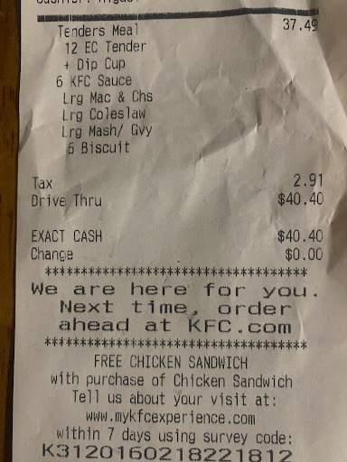 Read moreVery disappointed with the food. I really don't know what is wrong with this store. We went once a couple of months ago and said that their "chef" wasn't on their break so they couldn't serve us any chicken, didn't know it was that hard ro fry chicken but fine. Went to give it a chance today and oh boy. Well all you need is pictures to know, but yeah the chicken not covered with the crispy skin and there was bearly batter on the actual chicken and the batter that was on there was undercooked and soggy. They were in some hurry, it shows in the food, yet I was the only person in the drive thru. I guess I can see why now. Extremely disappointed and pretty much done with this store, hopefully there is another KFC I can go to that actual does crispy...
