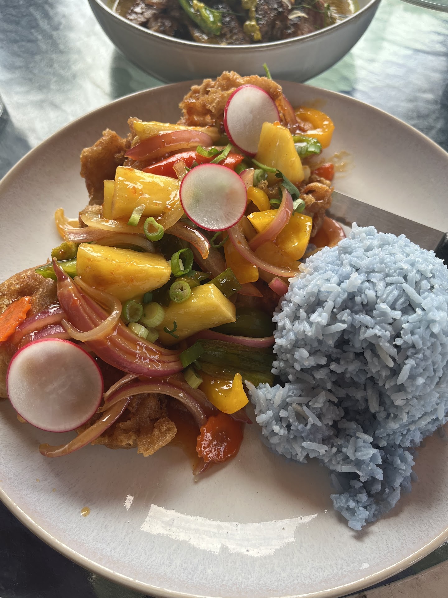 We had the mango sticky rice for dessert and it was the most colorful I've had. Purple rice, from a mix of black and white, with chopped mango and strawberry with the yummy sauce. It was excellent!