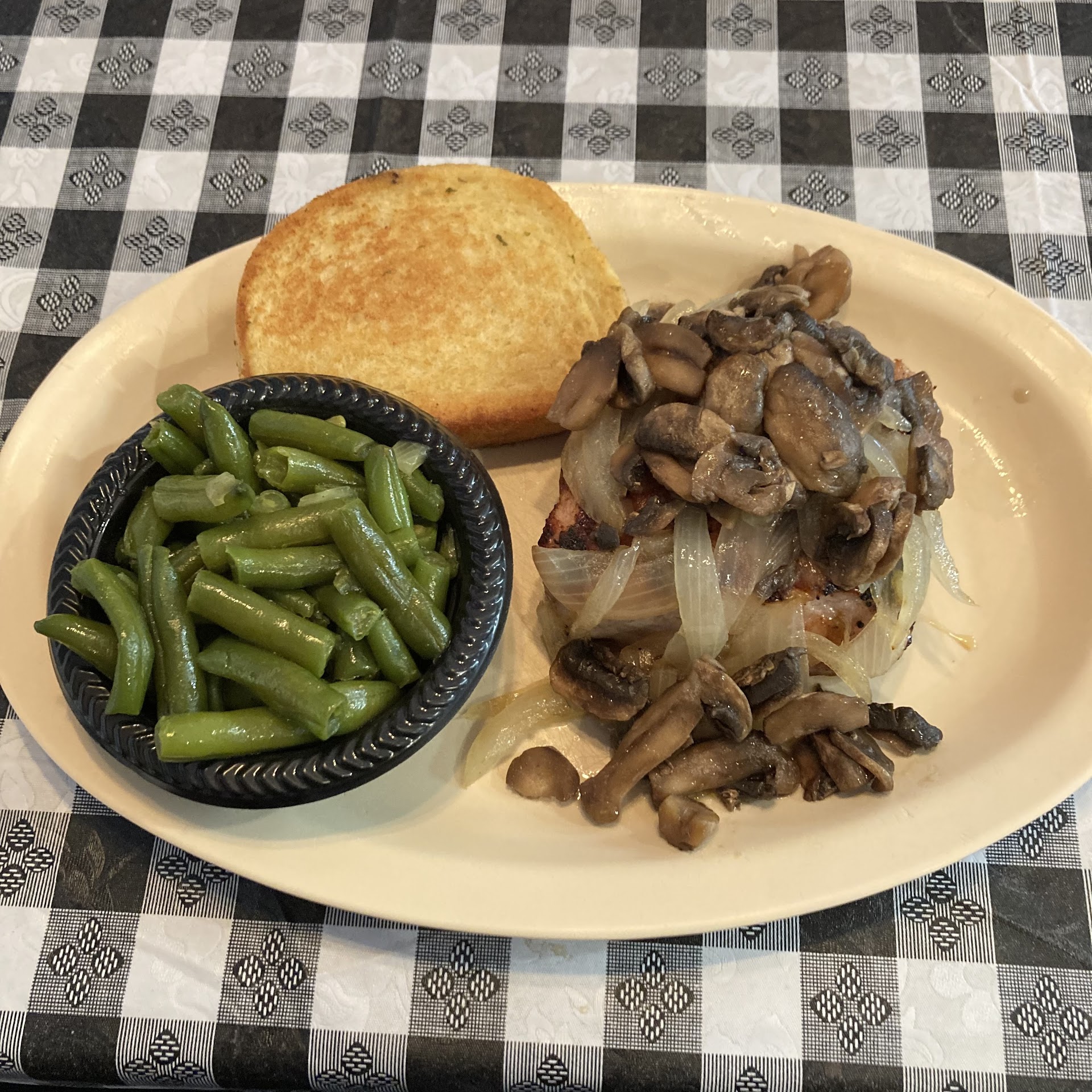 Hot & Juicy! I’ve been on a pork chop kick lately & this place popped up on my google search while I was driving around on a Saturday afternoon. It sounded good so I pull in, walk up to the huge, open counter with a grill (hearth) behind it & ordered a pork chop ($9.99). Since I’m still in holiday mode, I splurged on a side of mushrooms & grilled onions ($1/ea). Then, the patient guy behind the counter taking my order, asks what I would like for my 2 sides that were included. Oh?! My head was spinning because my sugar was running low & I hadn’t paid attention to the gigantic menu on the wall to the left of me, so, I’m thinking, this is going to be alot of food & finally decide on the mashed potatoes (to go) & the green beans (for here). I paid, grabbed a bottle of A1 steak sauce (which I was very happy to see) & sat in a huge wooden booth with a checkered tablecloth. Cozy. My plate was brought out by the nice hearth guy & the chop was - fire! Sooo juicy & good! The sautéed veggies were perfect & the warm garlic bread was buttery & not overpowering. I REALLY LIKE THIS PLACE! and by the stream of carry-out orders, I can see that others do too. (Just FYI, I took a star off for “Atmosphere,” because I felt a cold draft, which nobody else seemed to mind). Good...